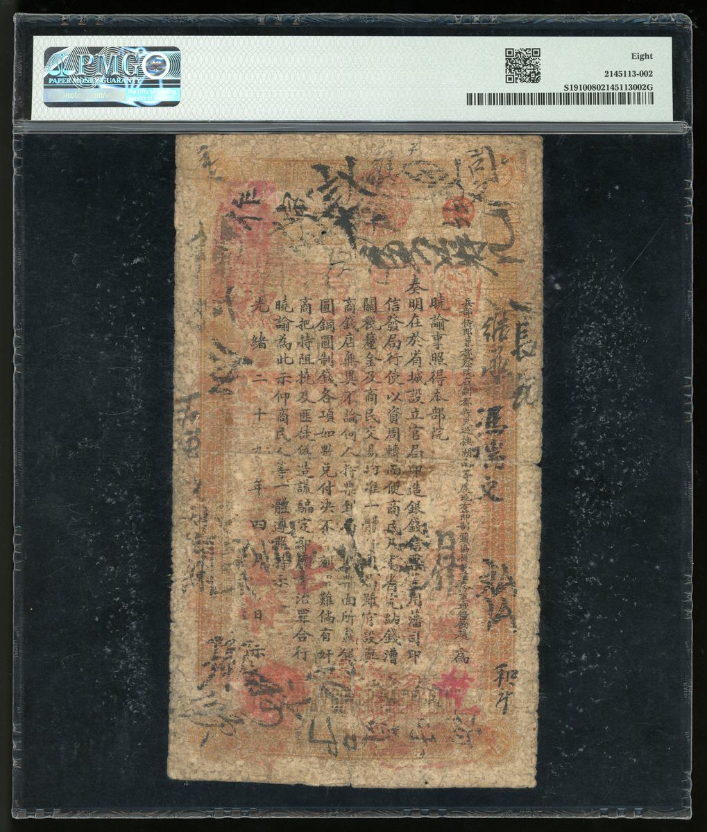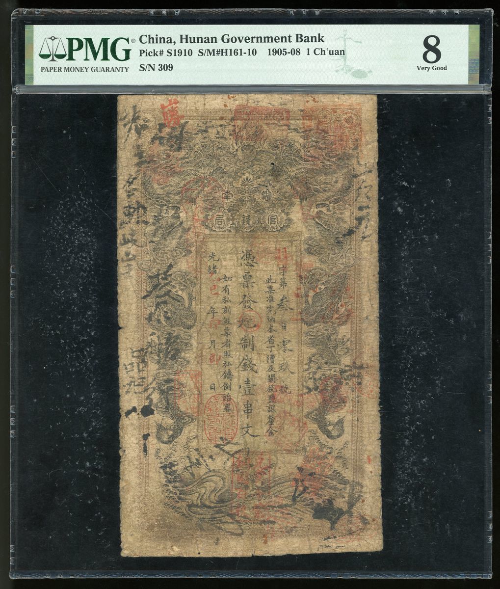 Hunan Government Bank, China, 1 chuan, Yisi year (1905), serial number 309, (Pick S1910), PMG 8 Very Good, a challenging Qing Dynasty issue with plenty of annotations, ornate engraving nonethelss and free from repairs