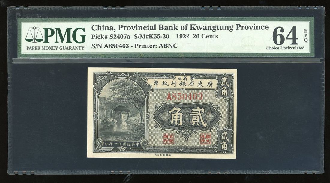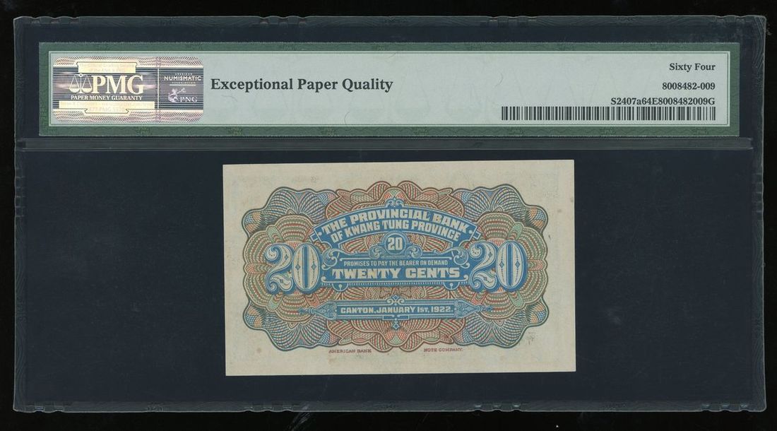 Provincial Bank of Kwangtung Province, China, 20 cents, Year 11 (1922), serial number A850463, (Pick S2407a), PMG 64EPQ choice uncirculated