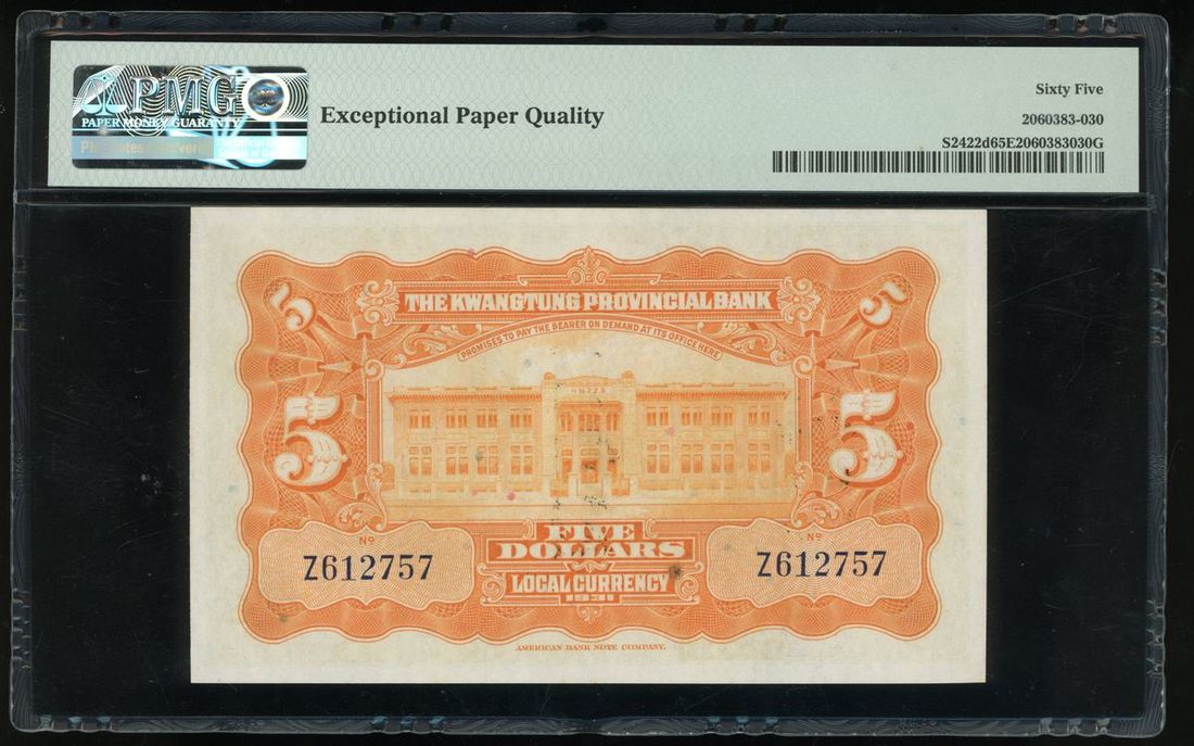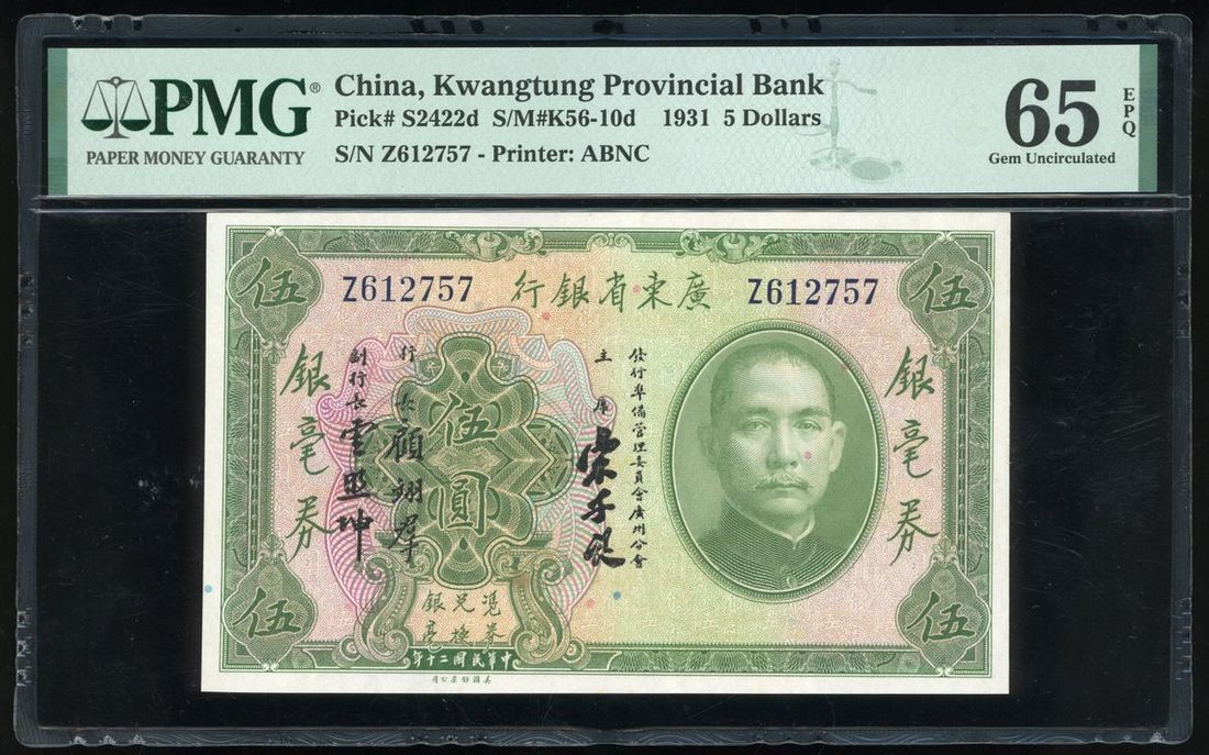 Kwangtung Provincial Bank, China, 5 yuan, Year 20 (1931), serial number Z612757, (Pick S2422d), PMG 65EPQ