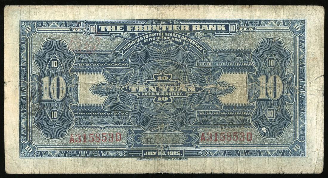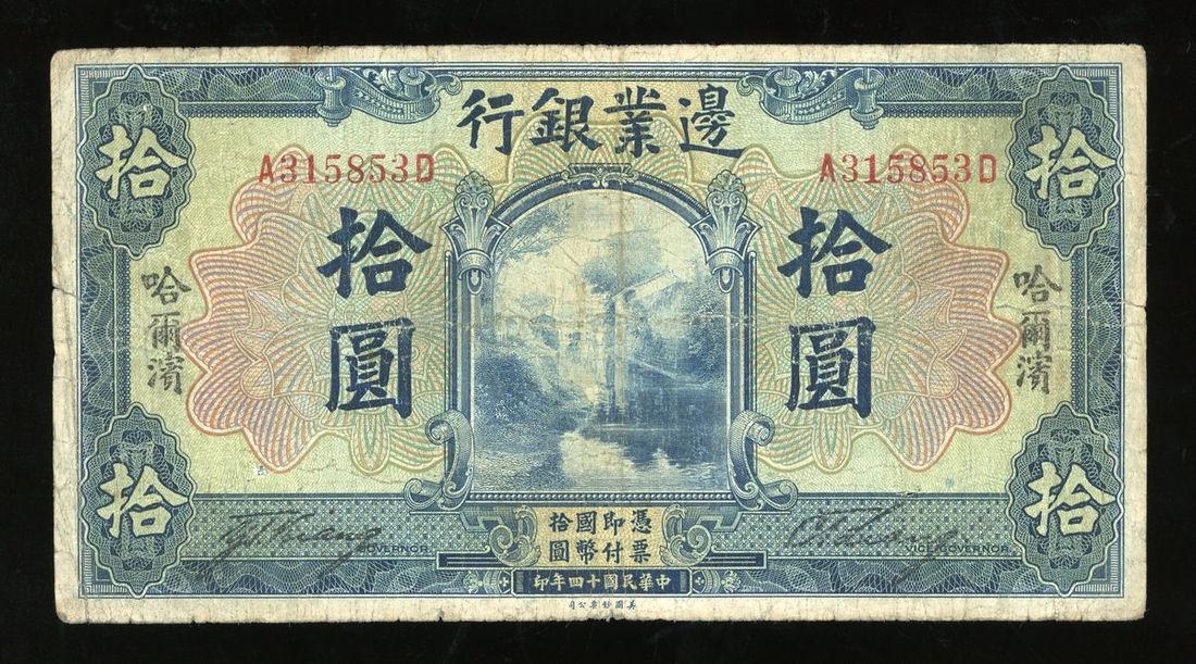 The Frontier Bank, 10 yuan, 1925, Harbin, serial number A315853D, (Pick S2572), stains, tear, about fone.