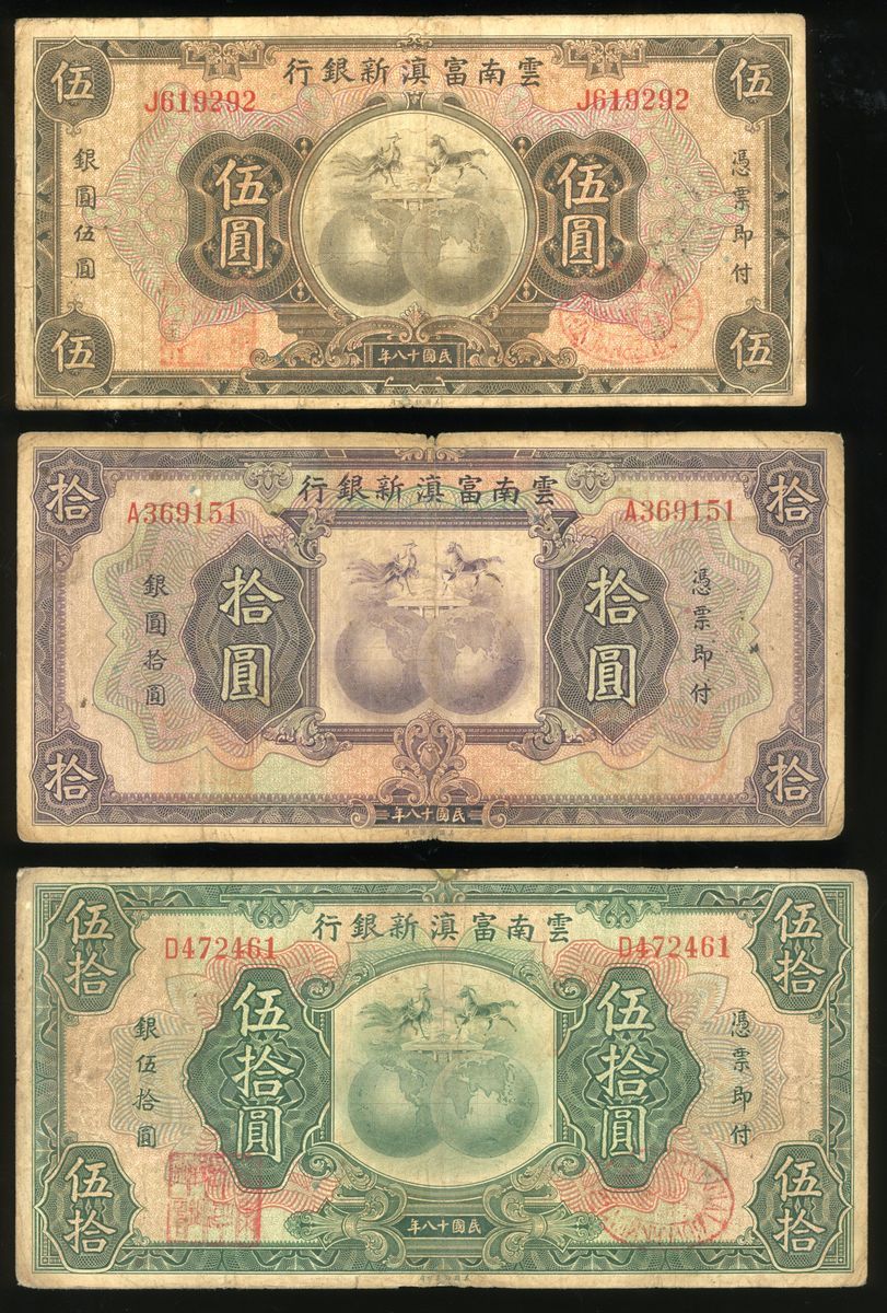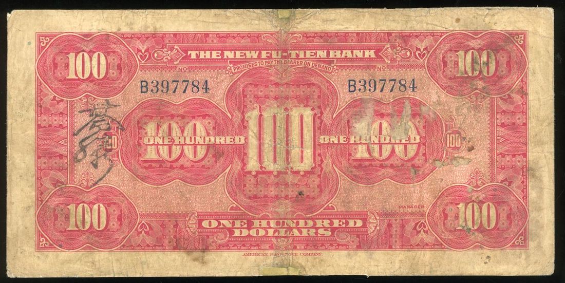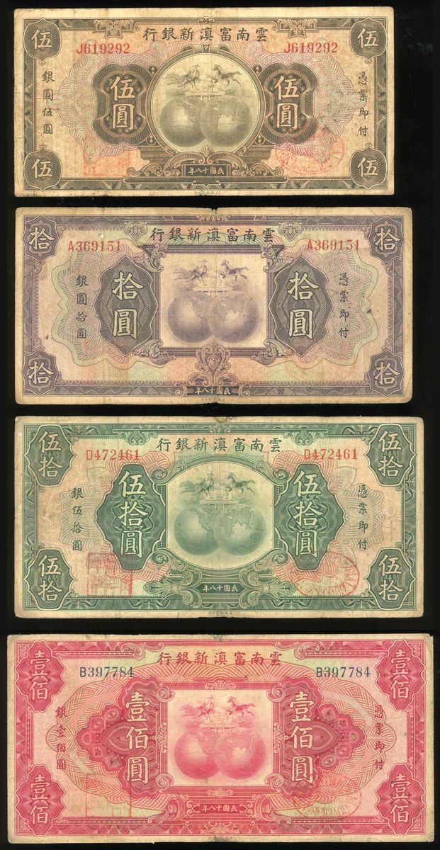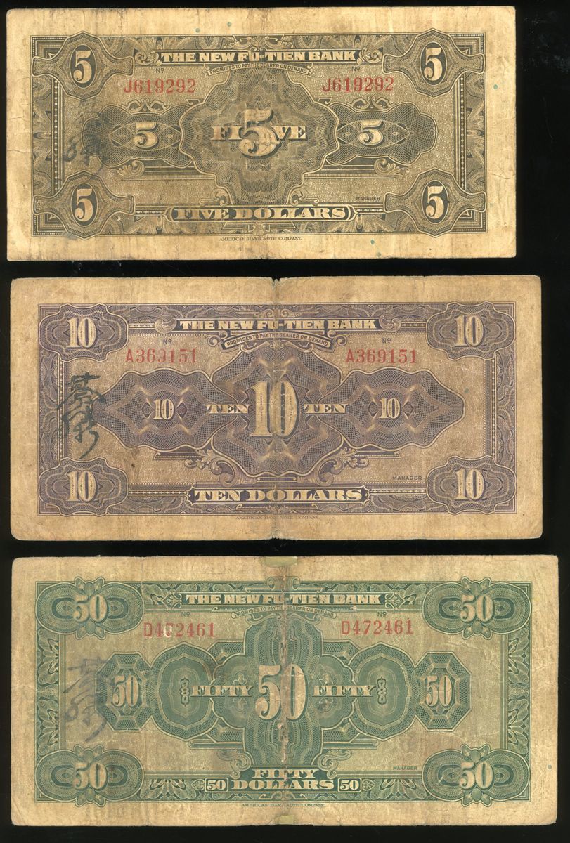 New Fu-Tien Bank, China, partial set of the 1932 issue, including 5, 10, 50 and 100 yuan, (Pick S2997, S2998, S2999, S3000), all with minor repairs at margins, good fine (4)