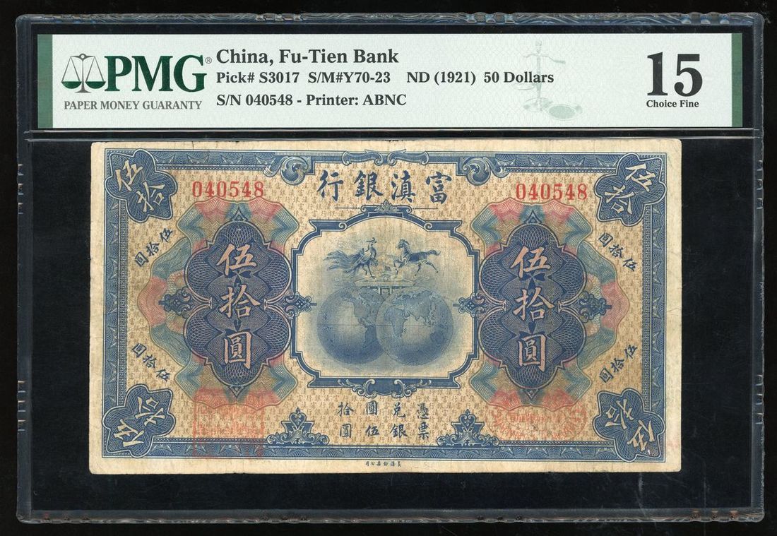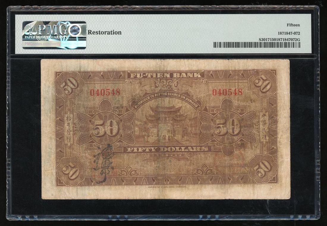 Fu-Tien Bank, China, 50 yuan, ND (1921), serial number 040548, (Pick S3017), PMG 15 choice fine, restoration. PMG Census with only 3 better. Issued note rare in any gtade.