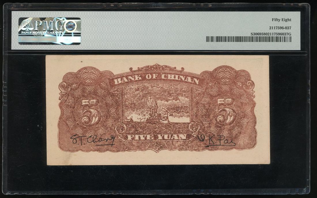 Bank of Chinan, China, 5 yuan, Year 28 (1939), 'no overprint', serial number O195937, (Pick S3069), PMG 58