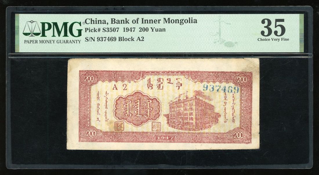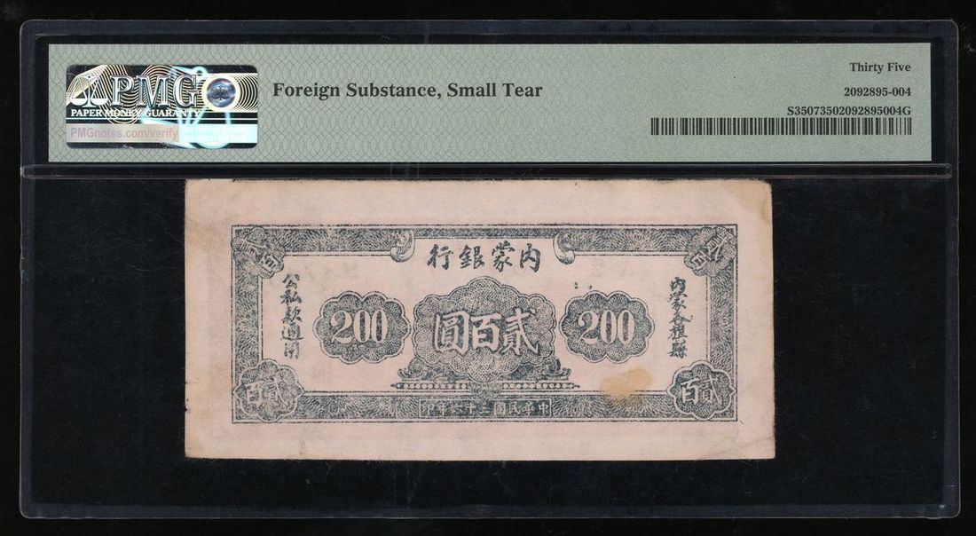 Bank of Inner Mongolia, 200 yuan, 1947, serial number 937469, (Pick S3507), PMG 35, foreign substance, small tear, rare.