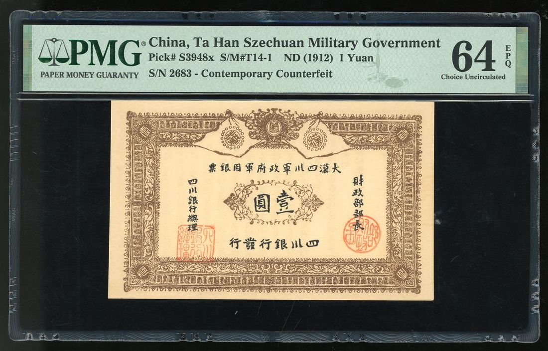 Ta Han Szechuan Military Government, China, CONTEMPORARY COUNTERFEIT 1 yuan, ND (1912), serial number 2683, brown and black, flags at top centre,