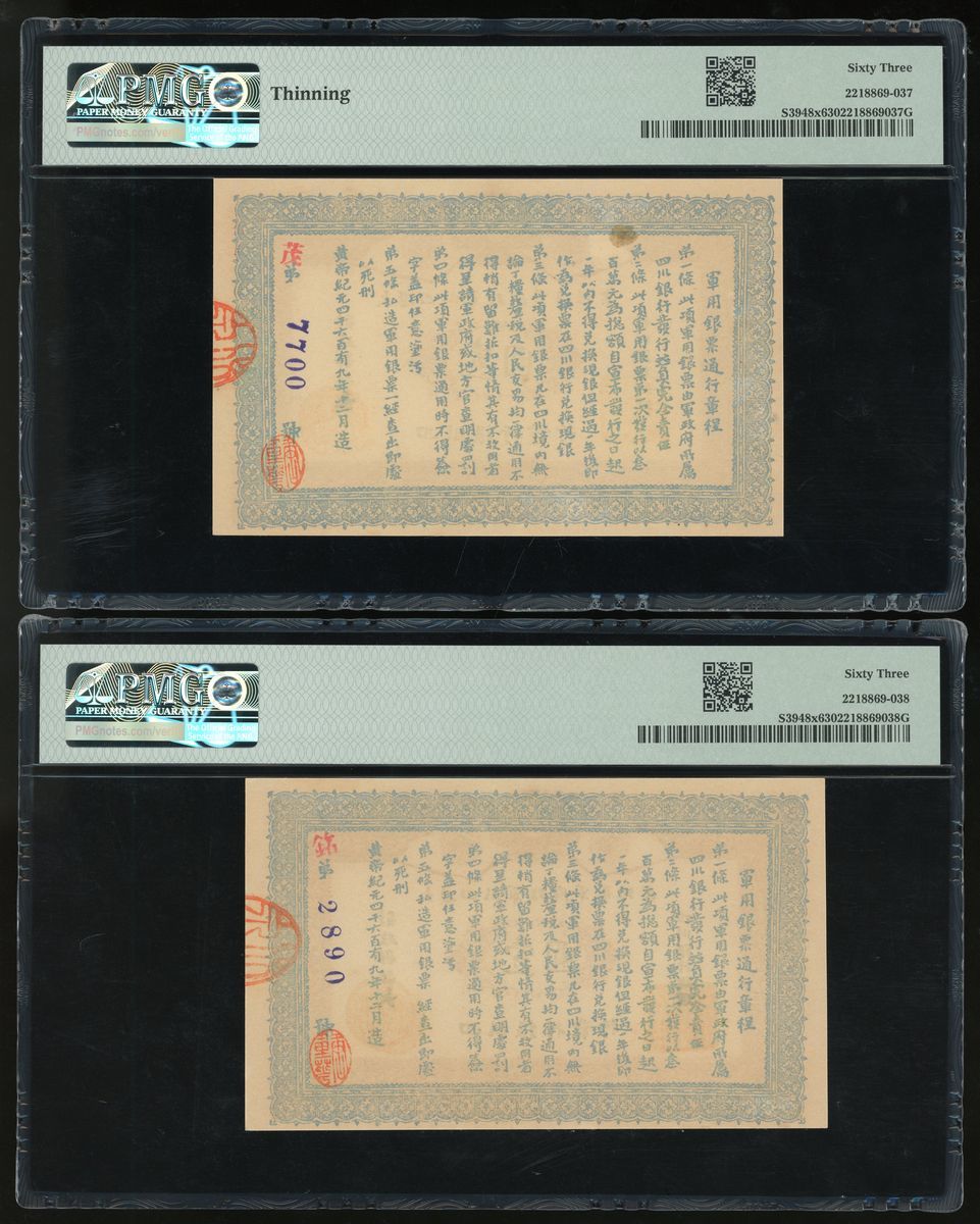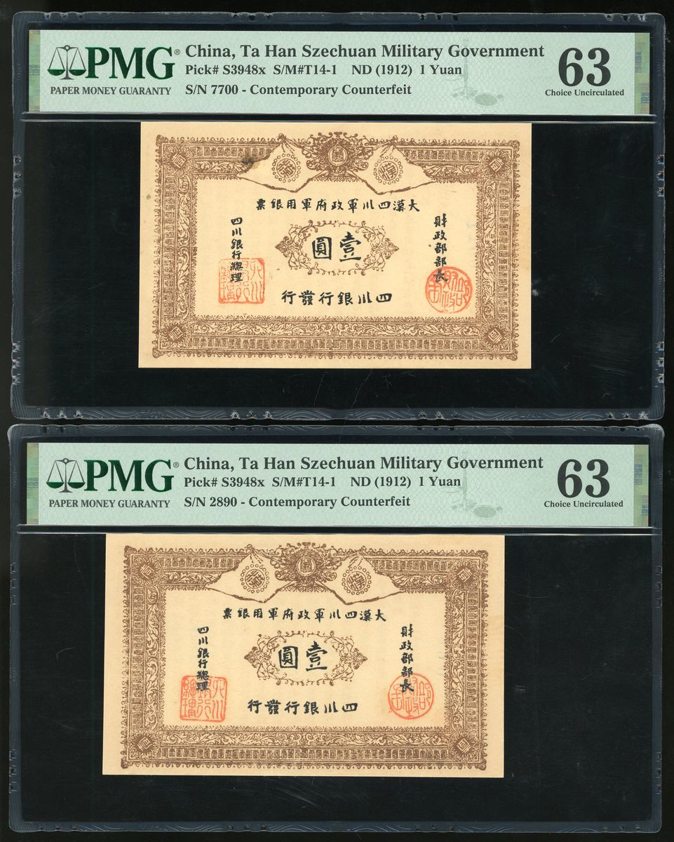 Ta Han Szechuan Military Government, China, a pair of CONTEMPORARY COUNTERFEIT 1 yuan, ND (1912), serial numbers 7700 and 2890, brown and black, flags at top centre,