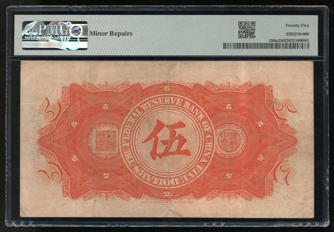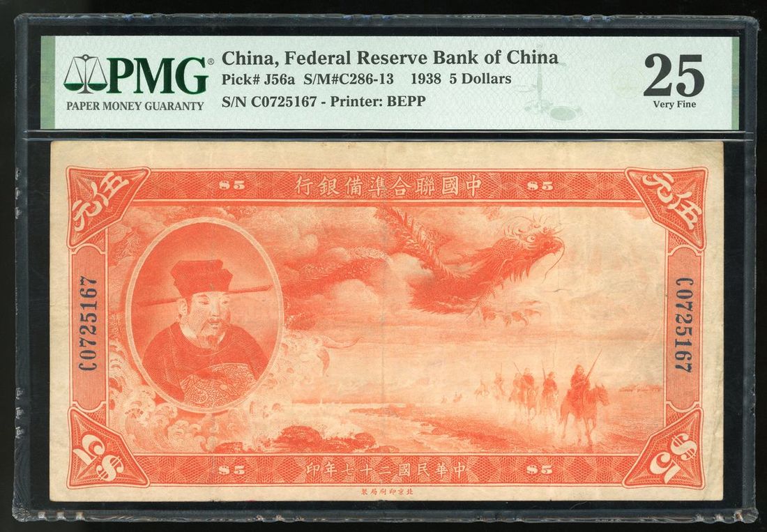 The Federal Reserve Bank of China, $5, Year 27 (1938), serial number C 0725167, (Pick J56a), PMG 25 Very Fine (Minor Repairs). One of the key types of the 'flying dragon' series after the $100.