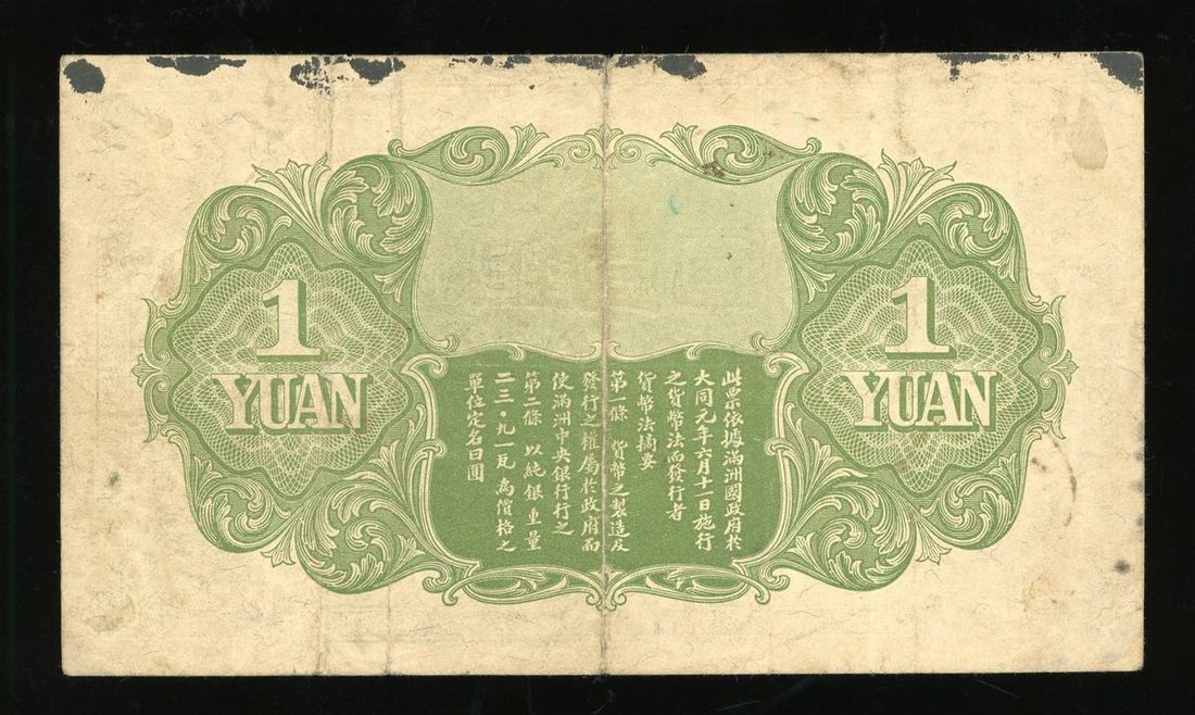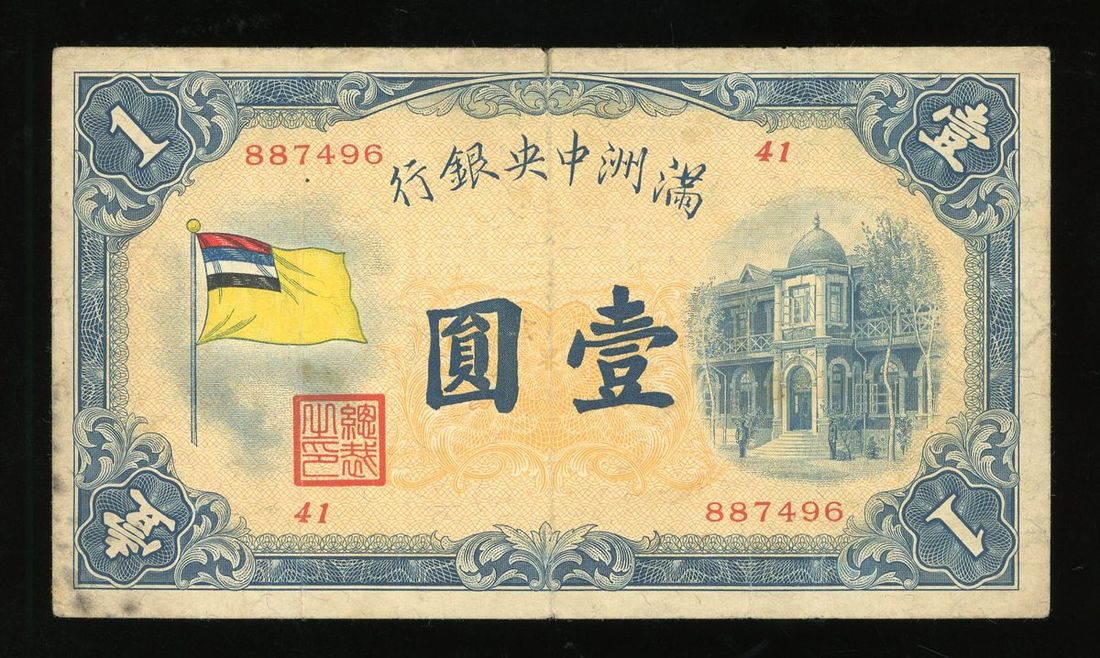 Central Bank of Manchukuo, 1 yuan, ND(1932-33), serial number 887496, (Pick J125), stains, good fine.