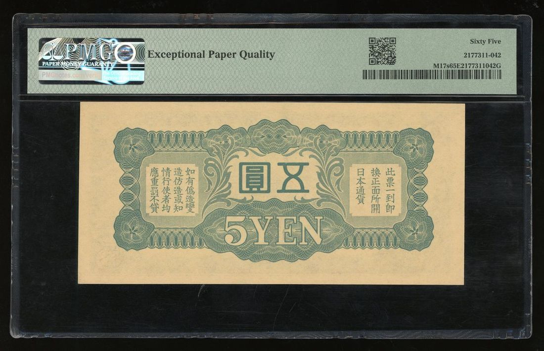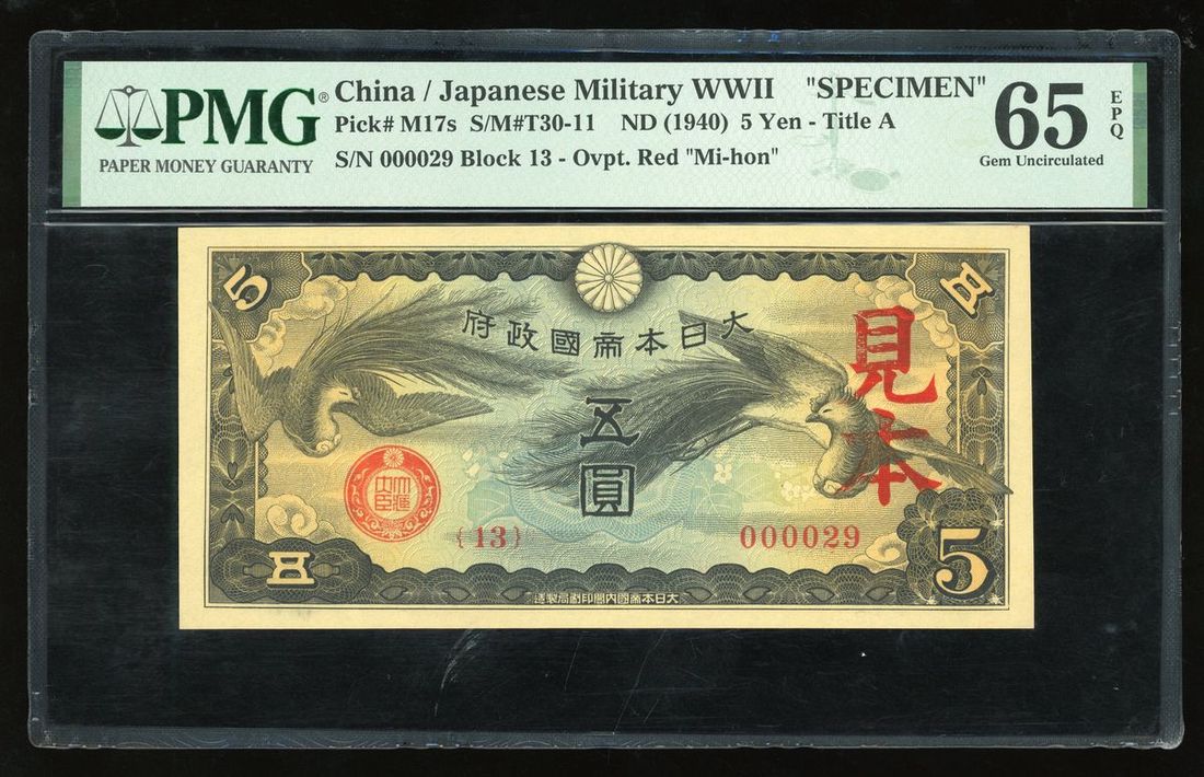Japanese Military WWII, China, specimen 5 yen, ND (1940), serial number 000029, block 13, with red 'mi-hon' overprint,