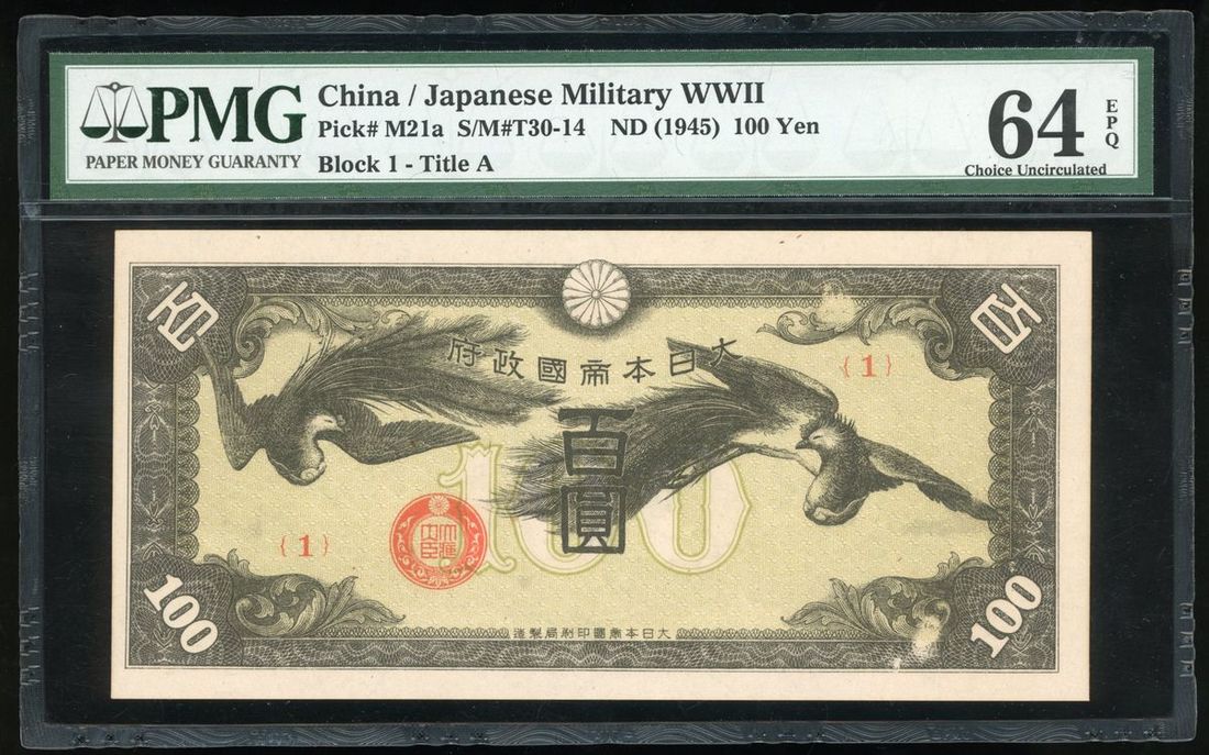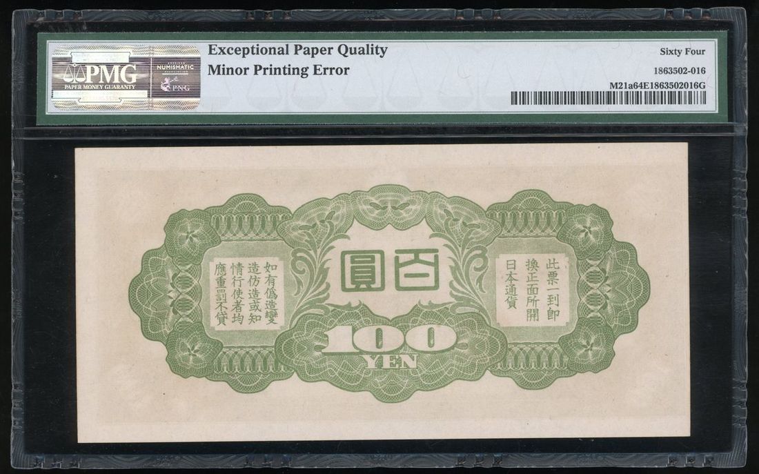 Japanese Military WWII, China, ERROR 100 yen, ND (1945), block 1, minor missing ink printing error at lower right,