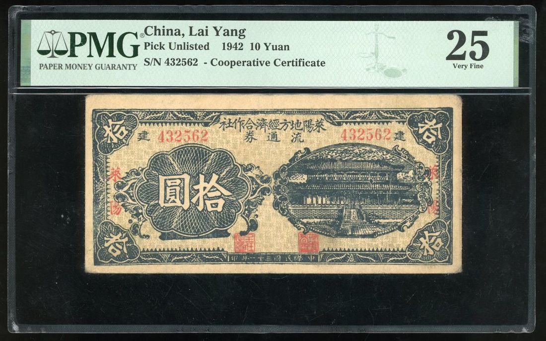 Lai Yang Economic Coopoerative Certificate, China, 10 yuan, Year 31 (1942), serial number 432562, PMG 25