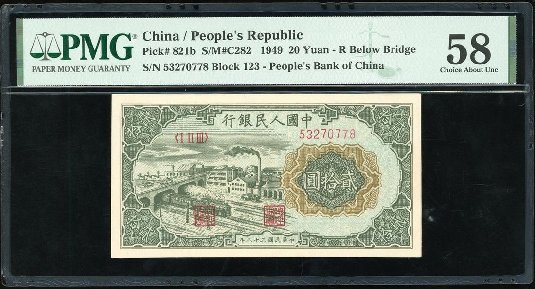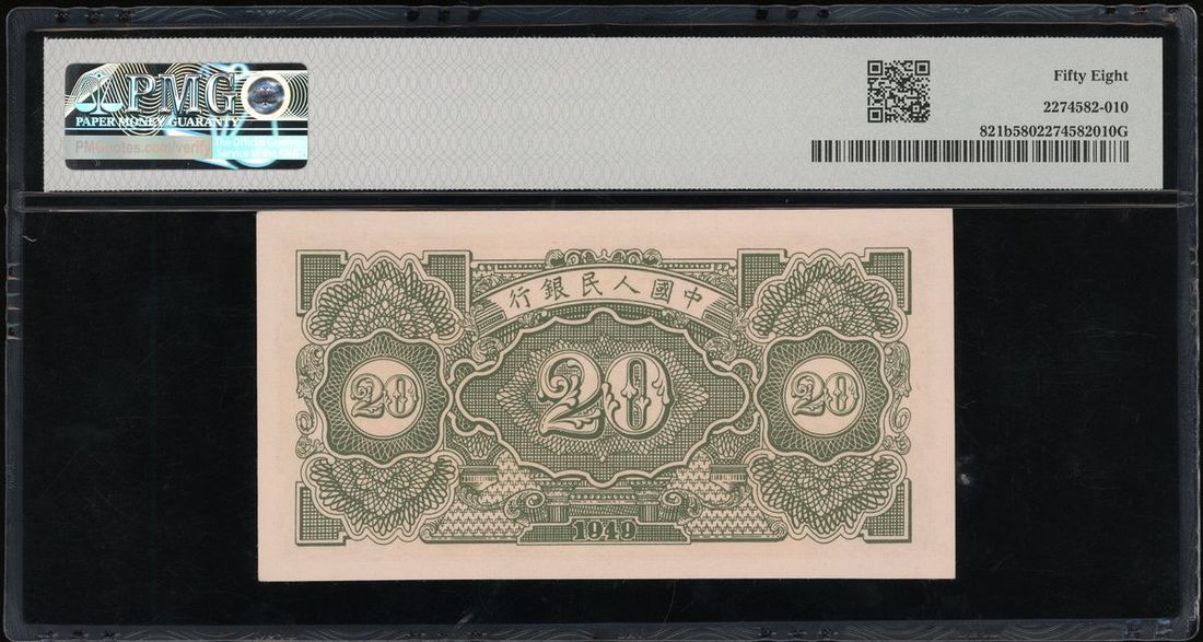 People's Bank of China, 1st Series Renminbi, 20 yuan, 1949, serial number I II III 53270778, (Pick 821b), PMG 58