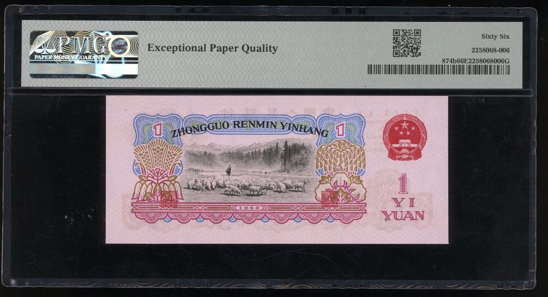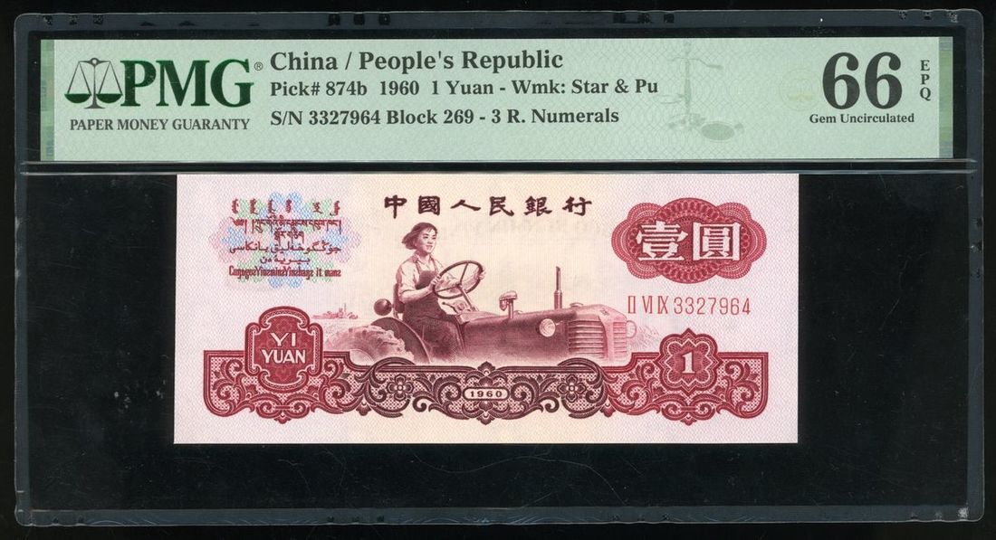 People's Bank of China, 3rd Series Renminbi, 1 yuan, 1960, serial number 3327964, (Pick 874b), PMG 66EPQ Gem Uncirculated