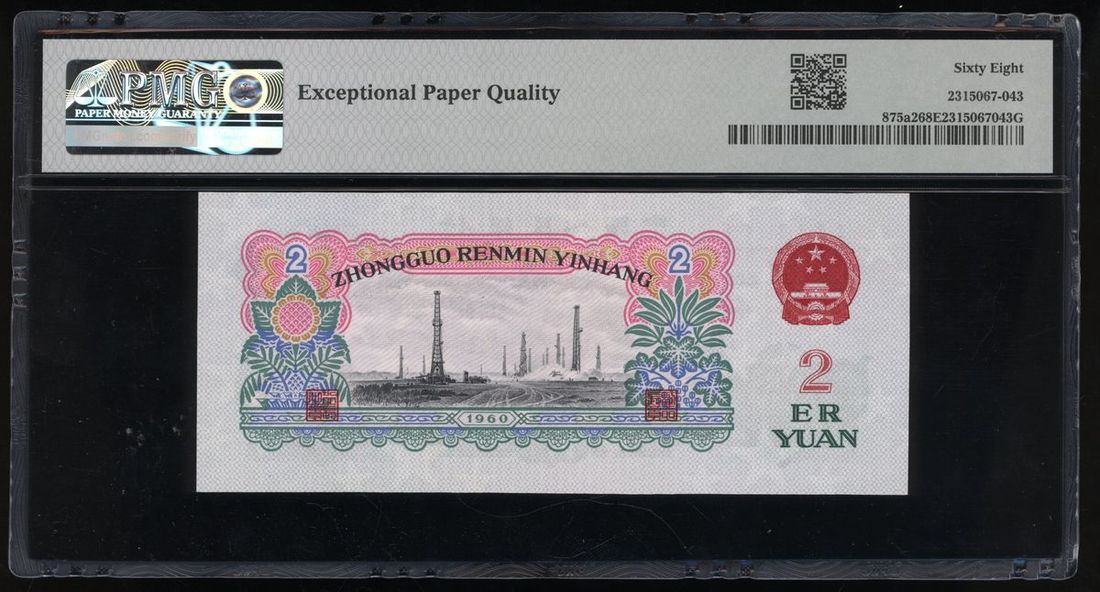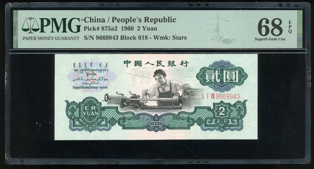 People's Bank of China, 3rd Series Renminbi, 2 yuan, 1960, serial number 9669943, 'stars' watermark, (Pick 875a2), PMG 68EPQ Superb Gem Uncirculated