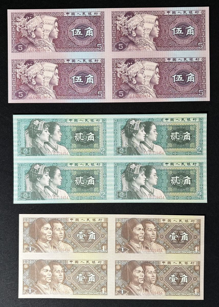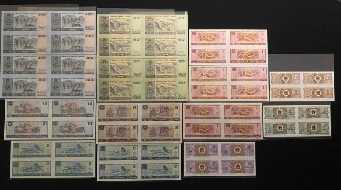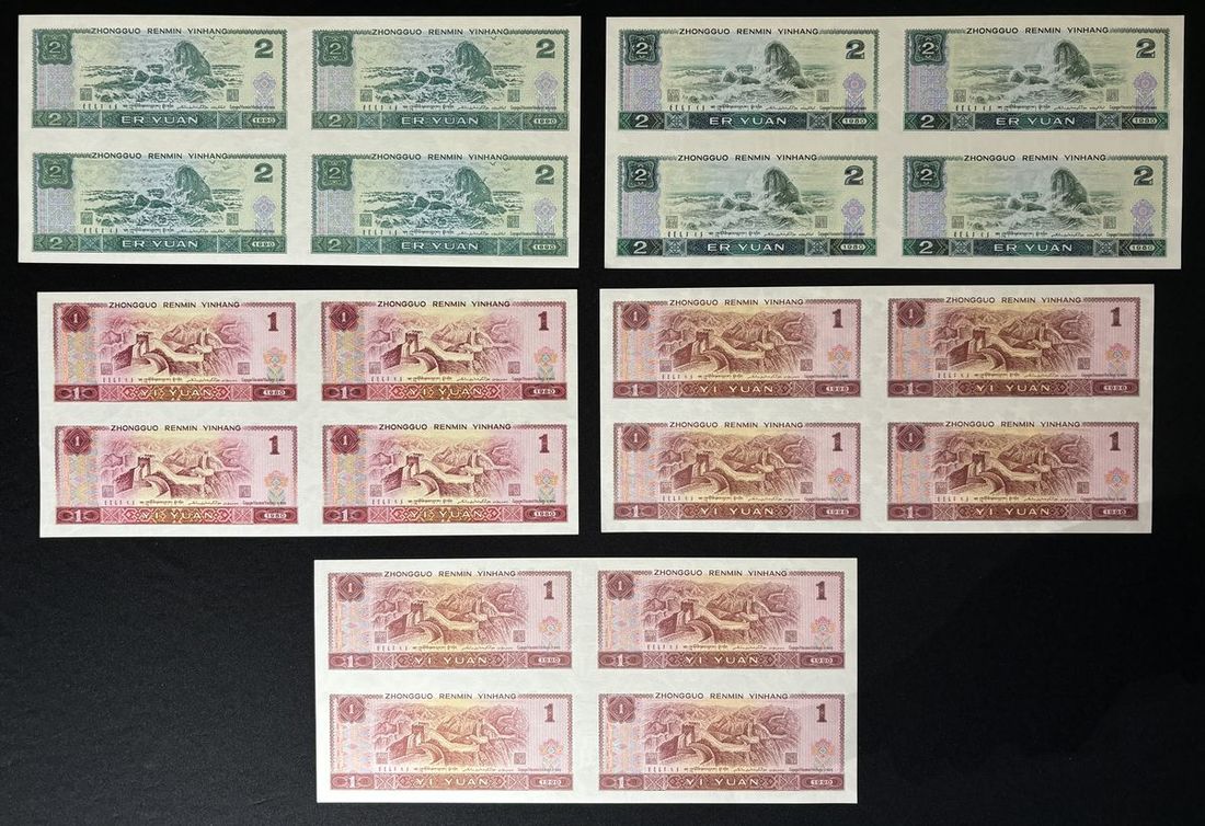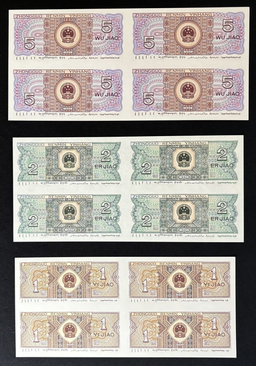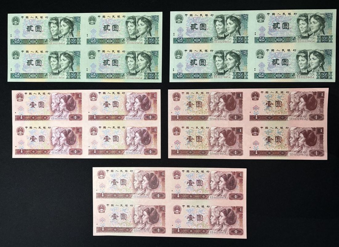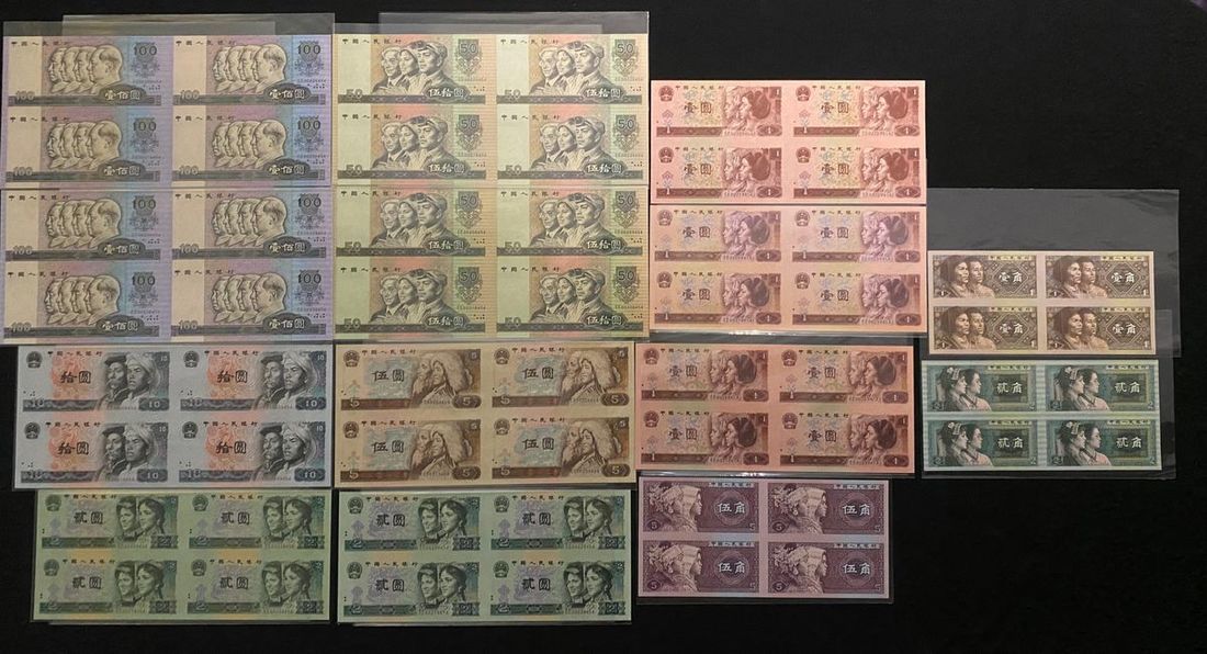 1980/1990/1996年中國人民銀行第四版人民幣四連體鈔一組14枚,壹角至壹佰圓,編號均以"9454"作結,UNC品相