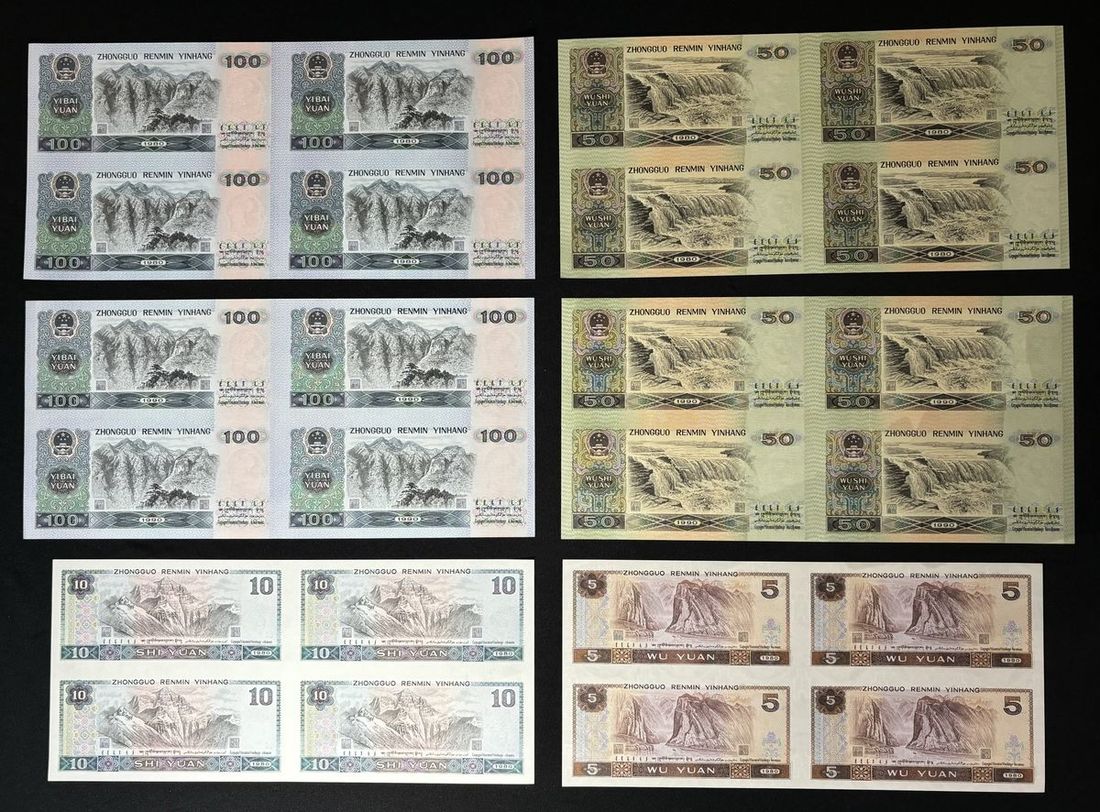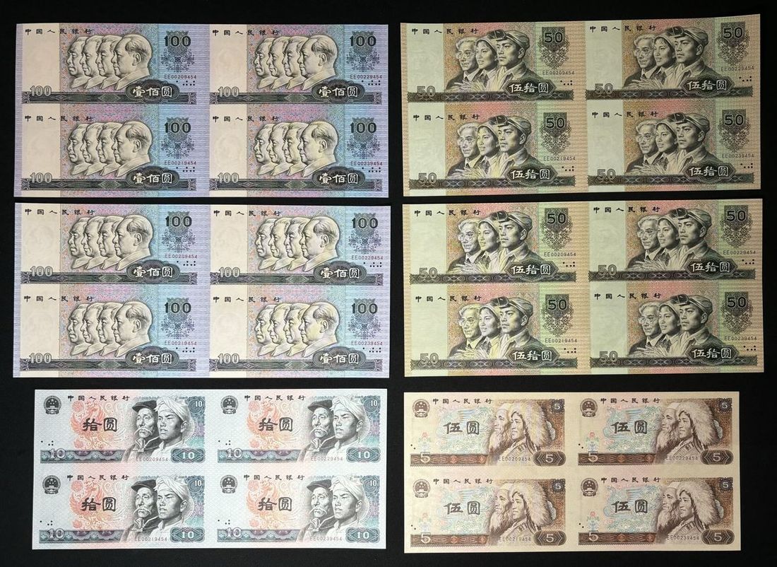 People's Bank of China, 4th Series Renminbi, a set of 14x uncut sheets of 4, 100 yuan to 1 jiao, 1980, 1990 and 1996, all with matching serial numbers and all ending with '9454',