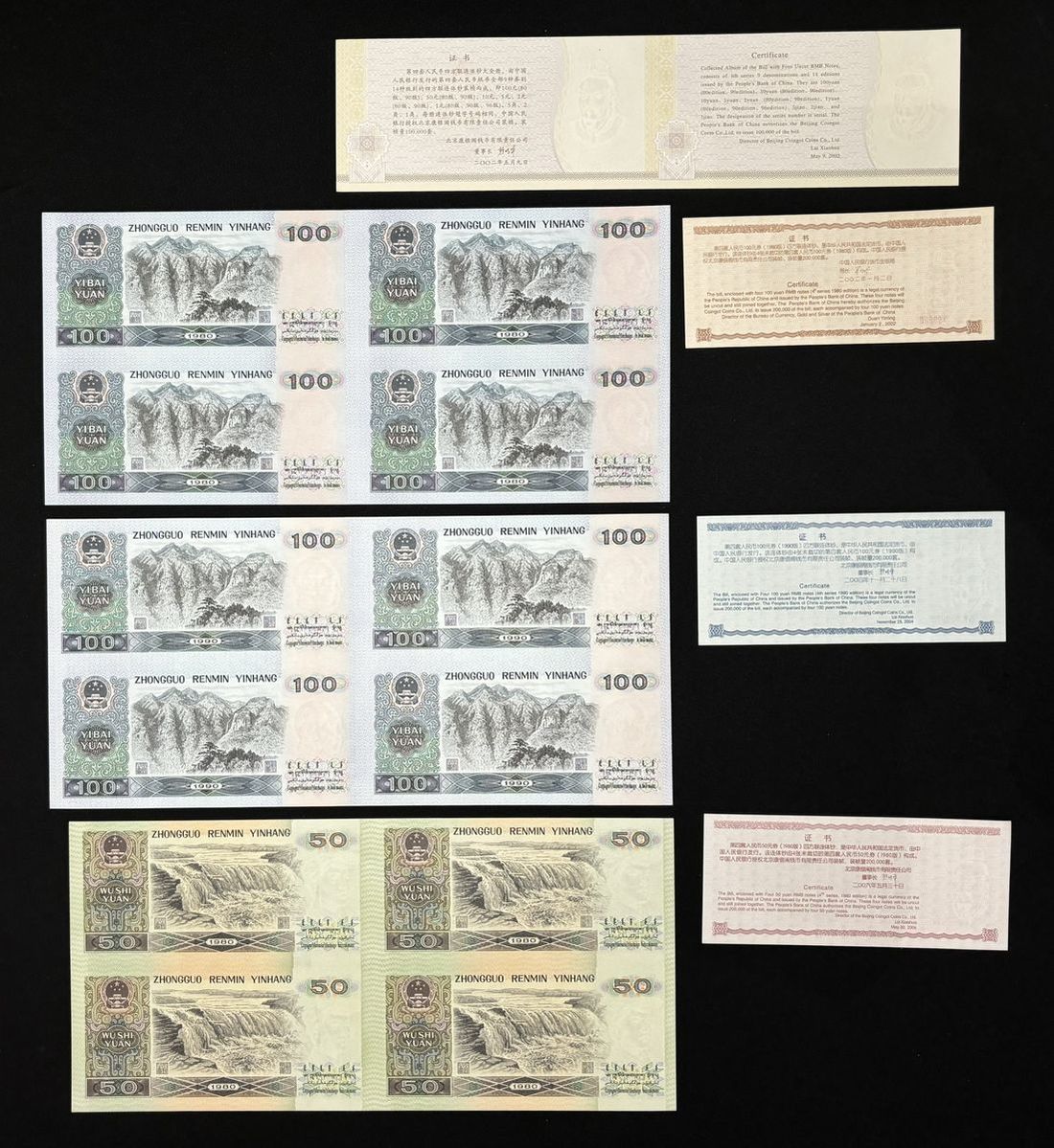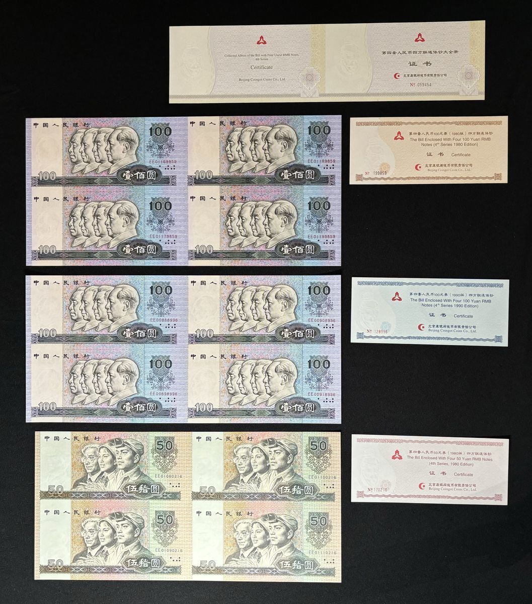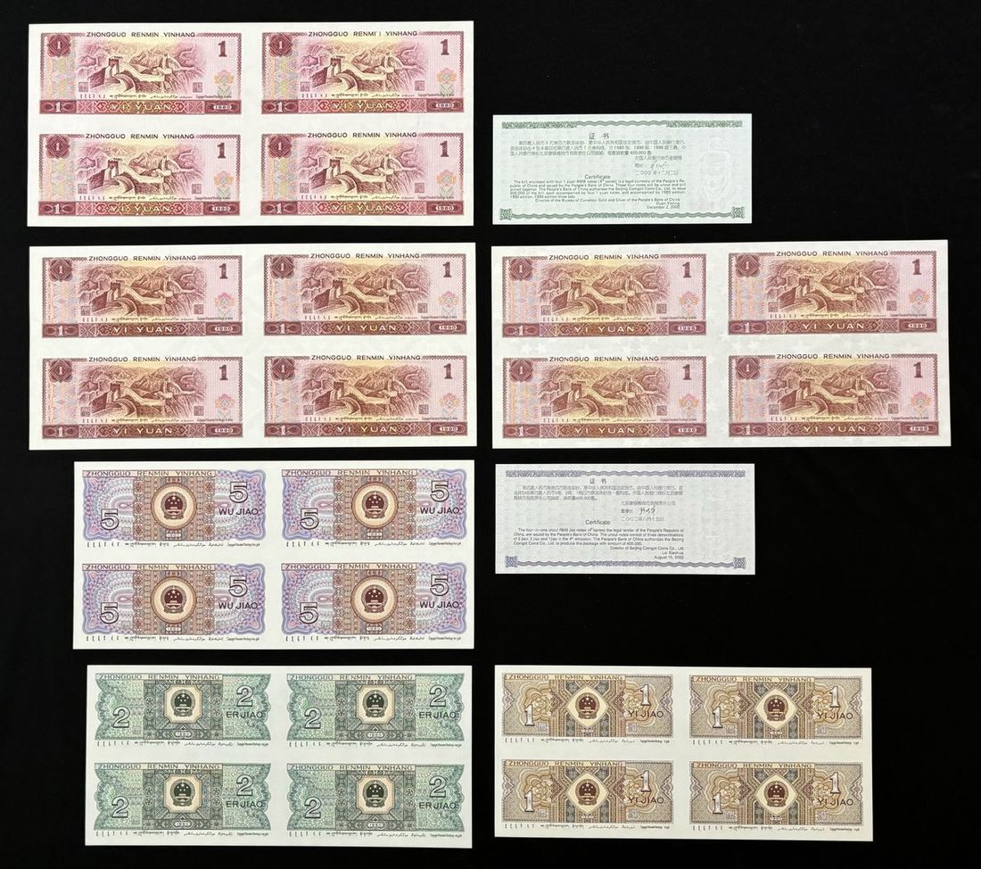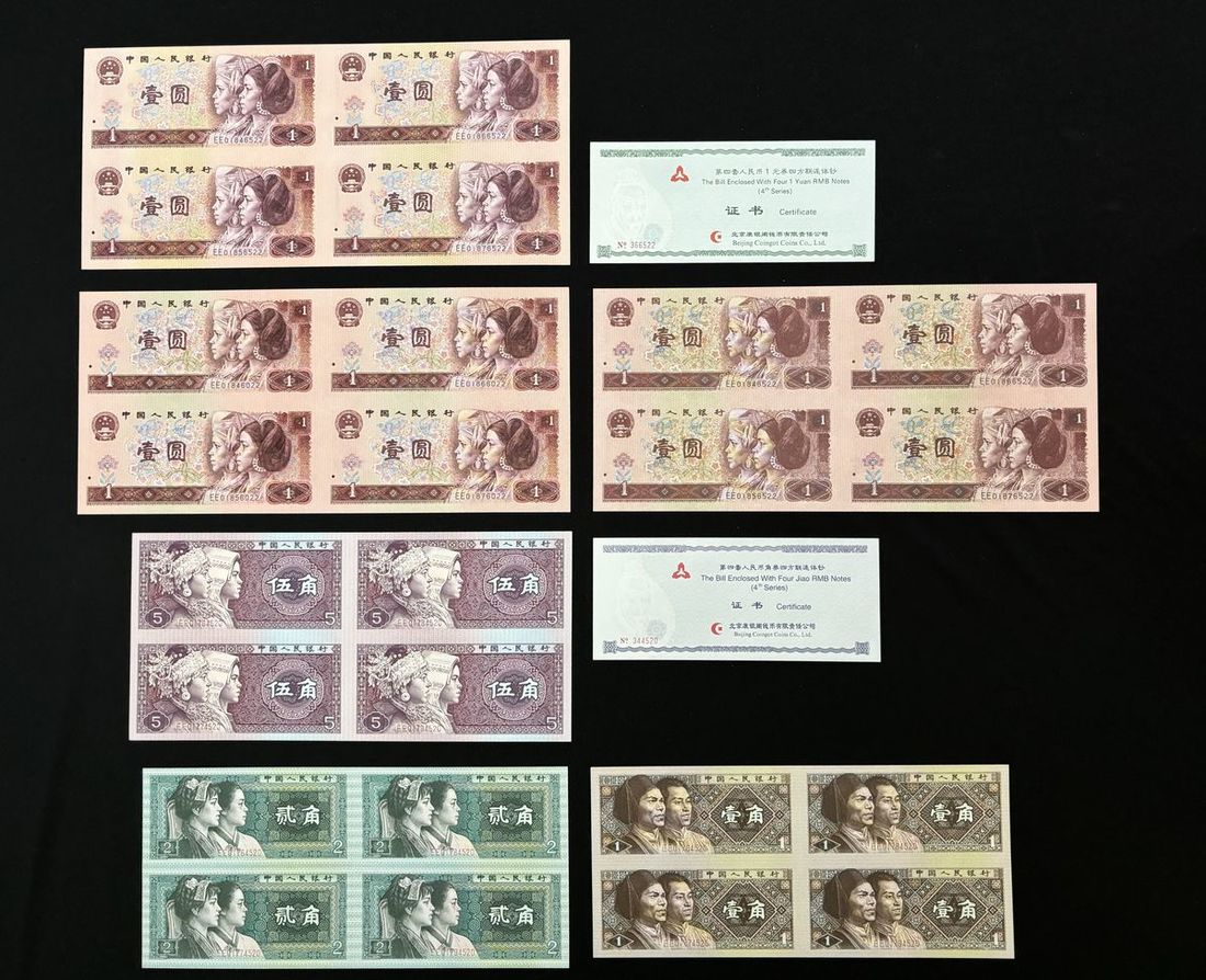 People's Bank of China, 4th Series Renminbi, a set of 14x uncut sheets of 4, 100 yuan to 1 jiao, 1980, 1990 and 1996,