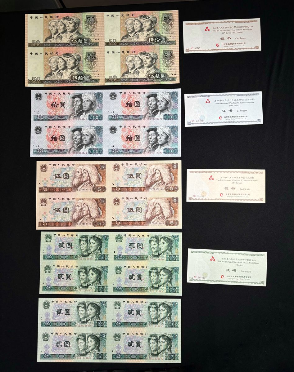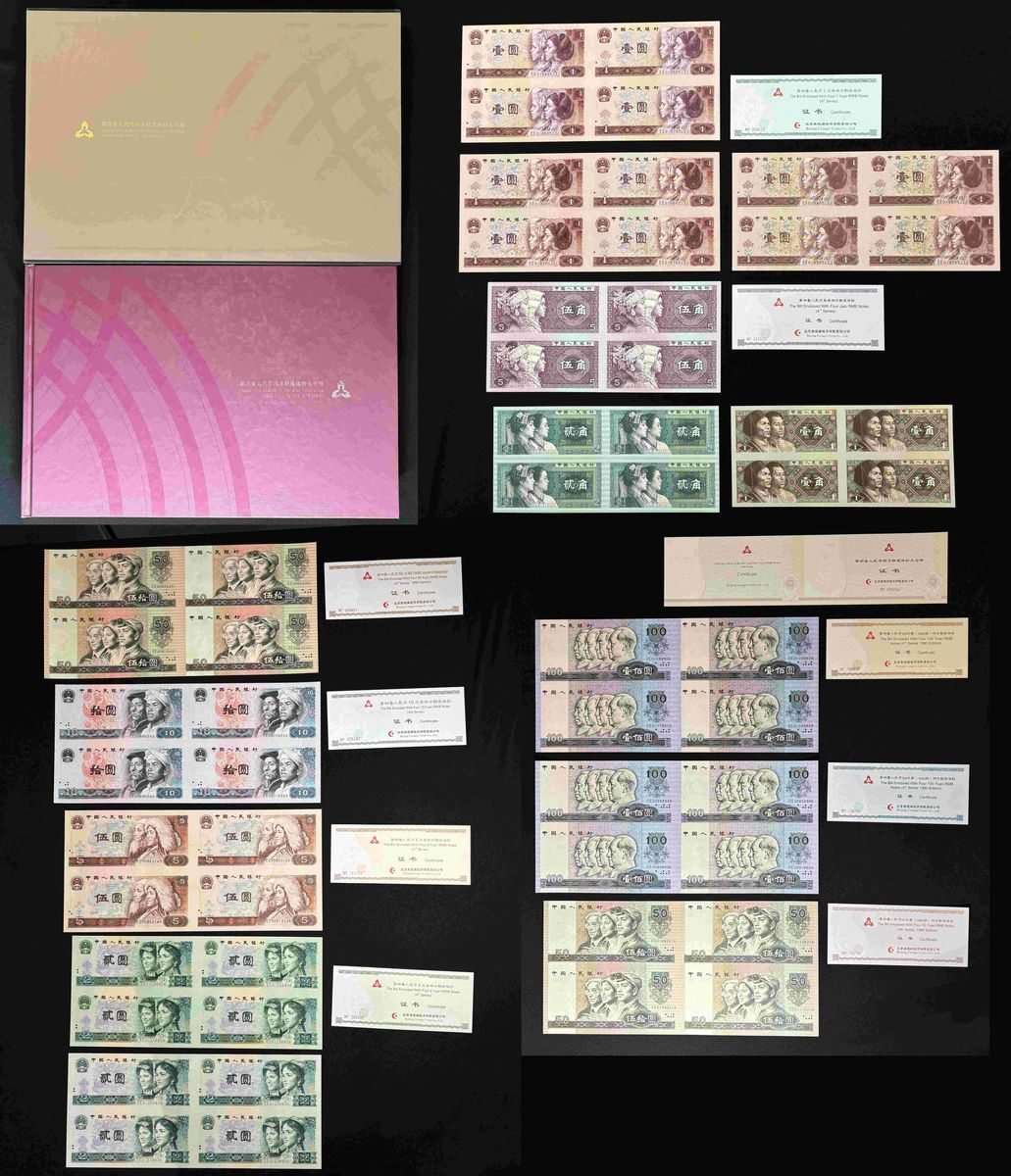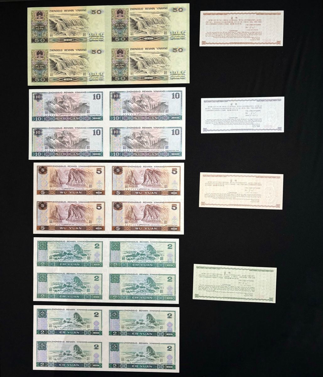 People's Bank of China, 4th Series Renminbi, a set of 14x uncut sheets of 4, 100 yuan to 1 jiao, 1980, 1990 and 1996,