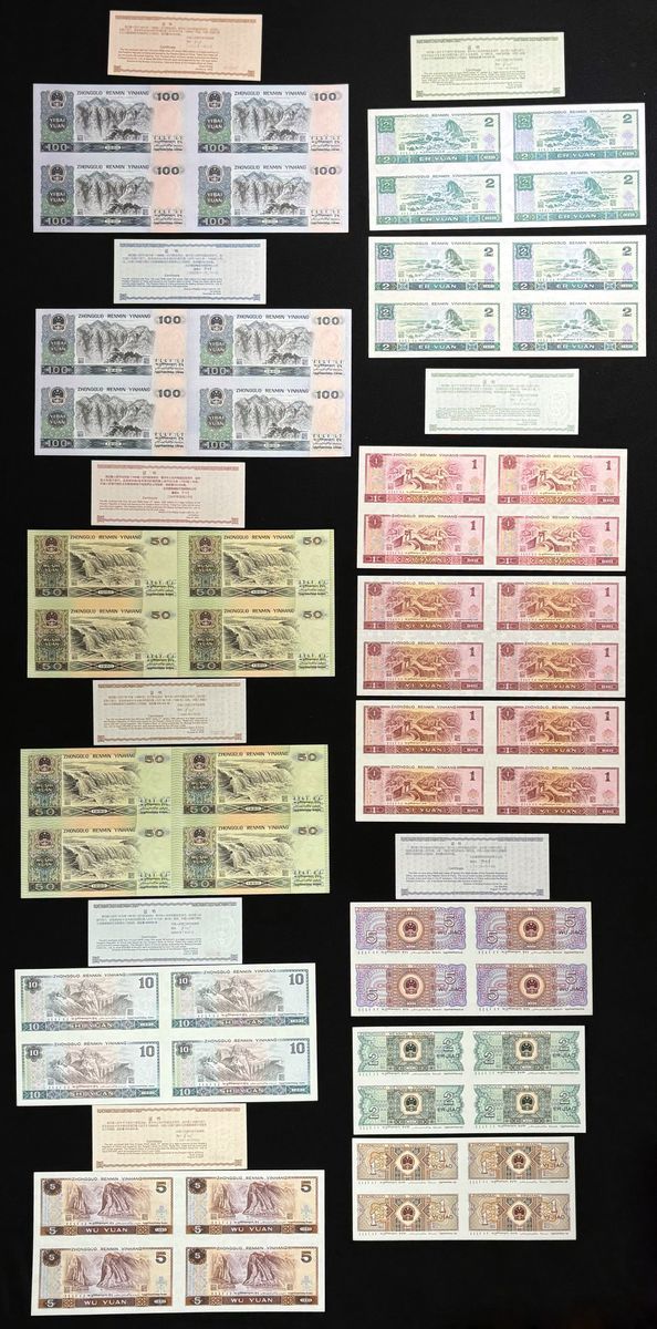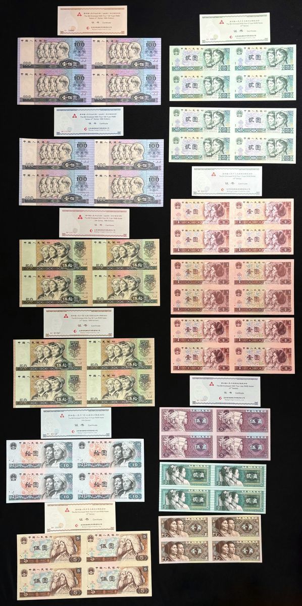 People's Bank of China, 4th Series Renminbi, a set of 14x uncut sheets of 4, 100 yuan to 1 jiao, 1980, 1990 and 1996,