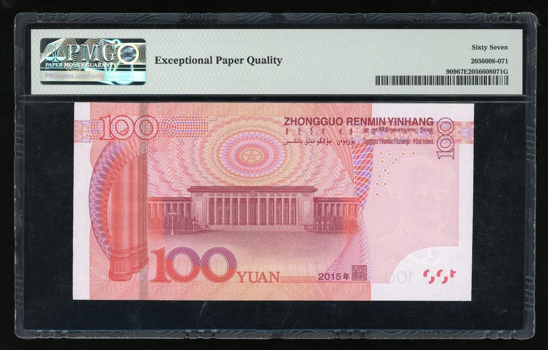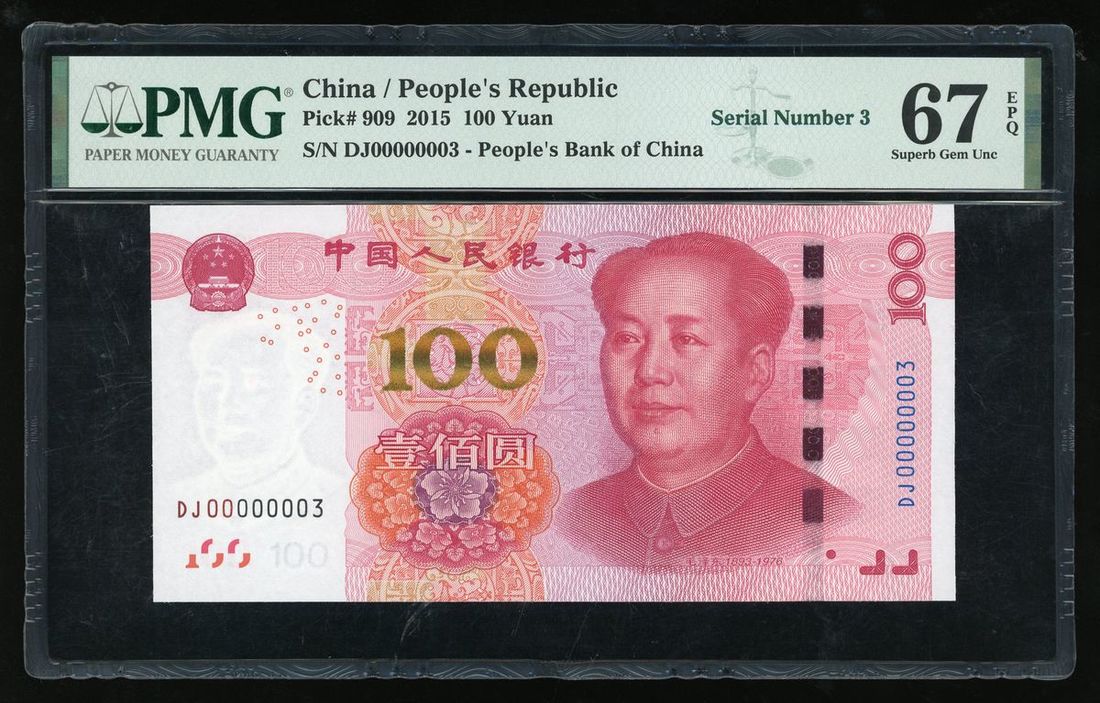 People's Bank of China, 5th Series Renminbi, 100 yuan, 2015, low serial number DJ00000003, (Pick 909), PMG 67EPQ Superb Gem Uncirculated