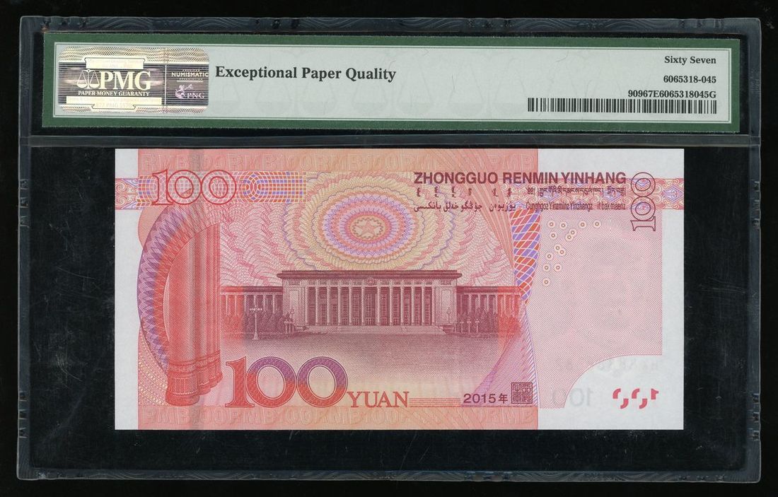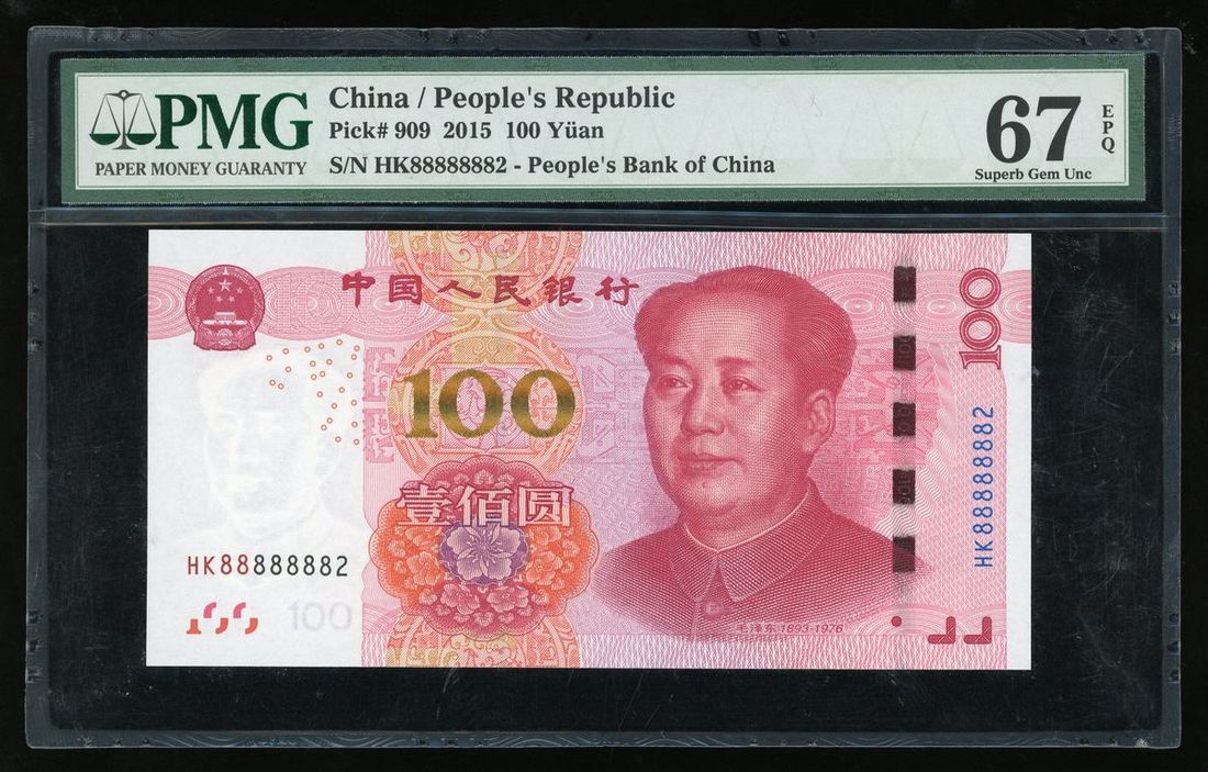 People's Bank of China, 5th Series Renminbi, 100 yuan, 2015, near solid serial number HK88888882, (Pick 909), PMG 67EPQ Superb Gem Uncirculated