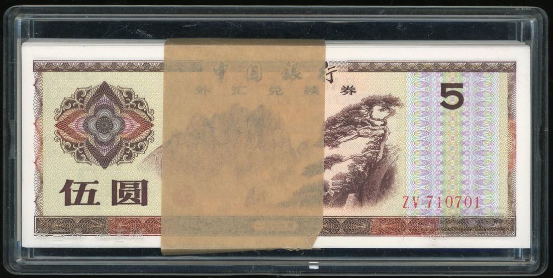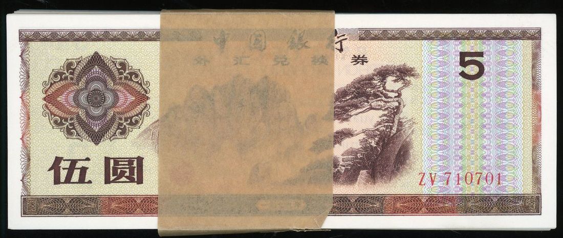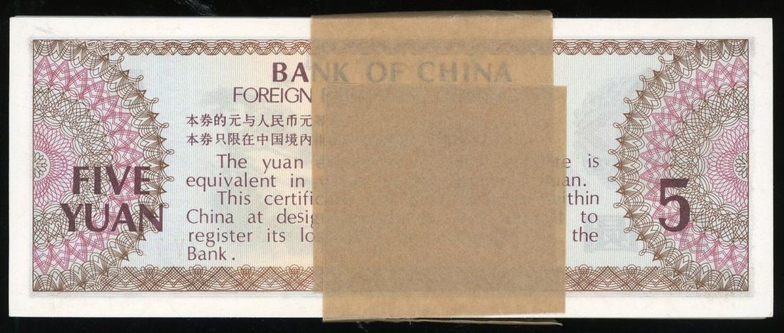Bank of China, Foreign Exchange Certificate, consecutive bundle of 5 yuan, 1979, serial numbers ZV710701-710800, (Pick FX4), includes repeater number 710710. With only minor handlling at corners, otherwise uncirculated (100)