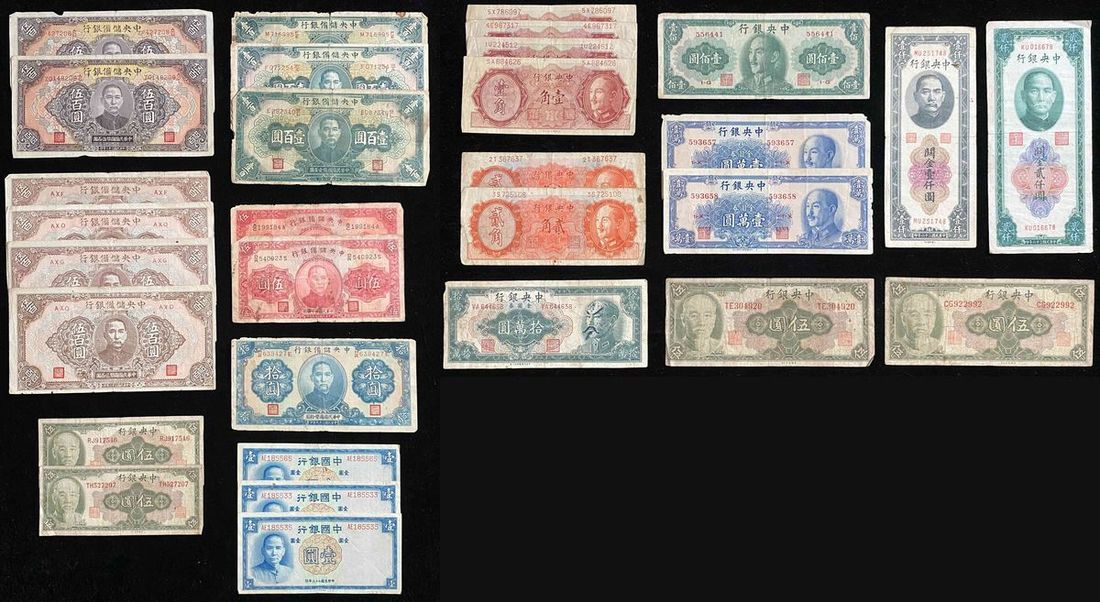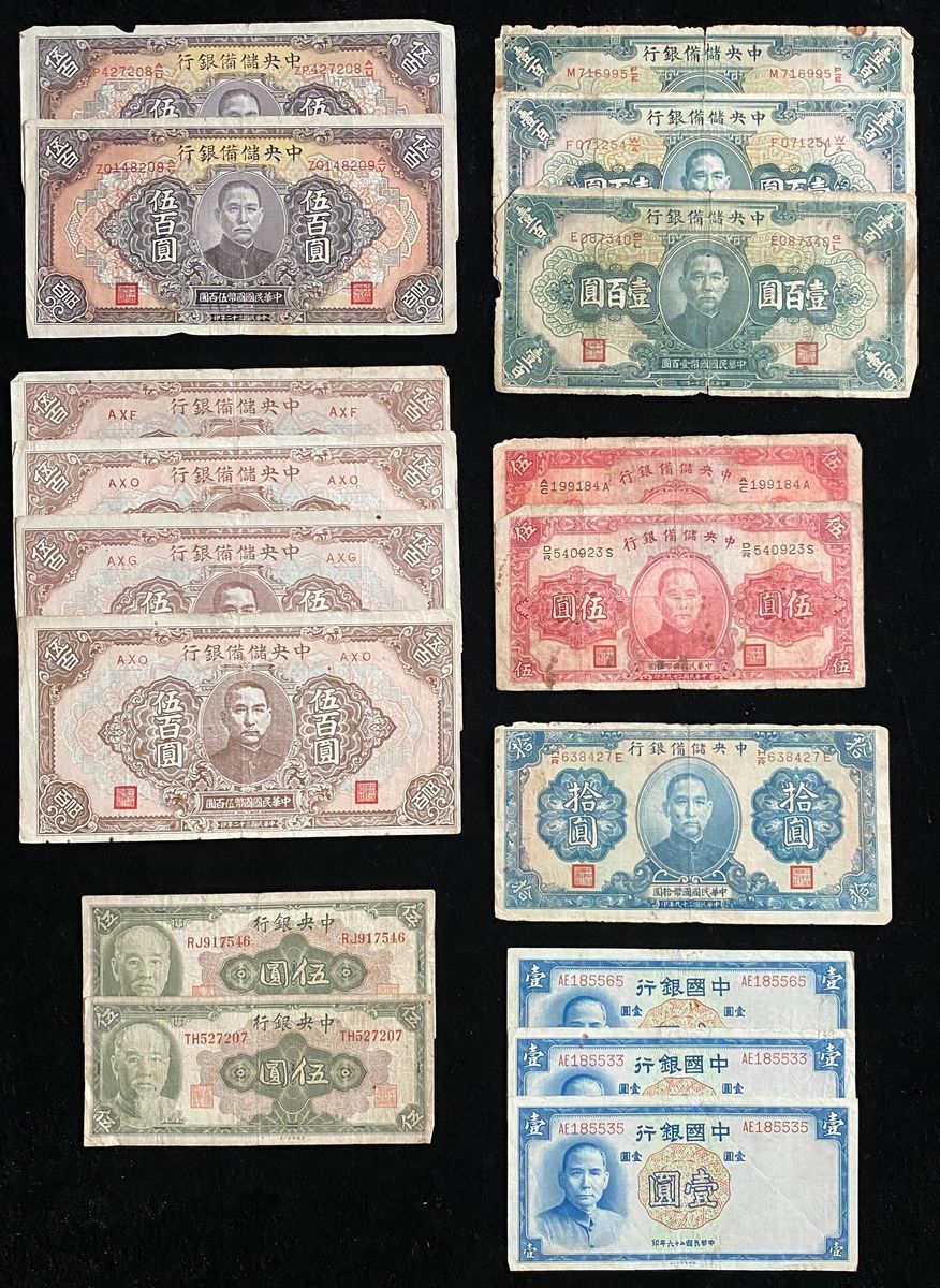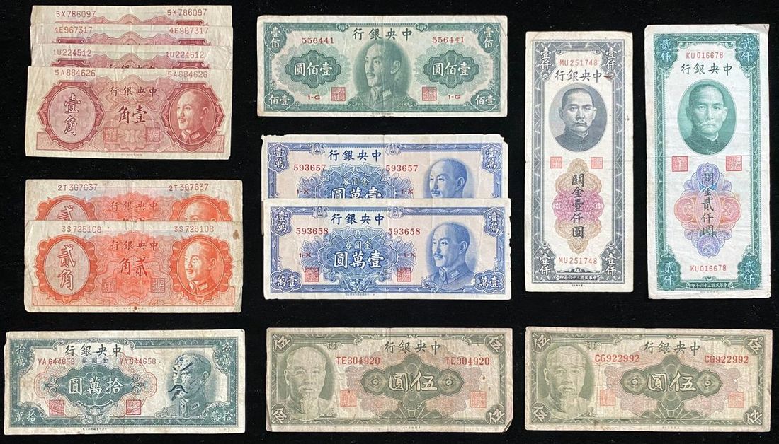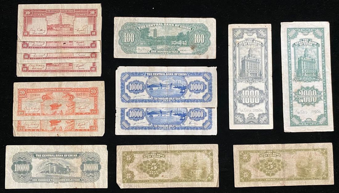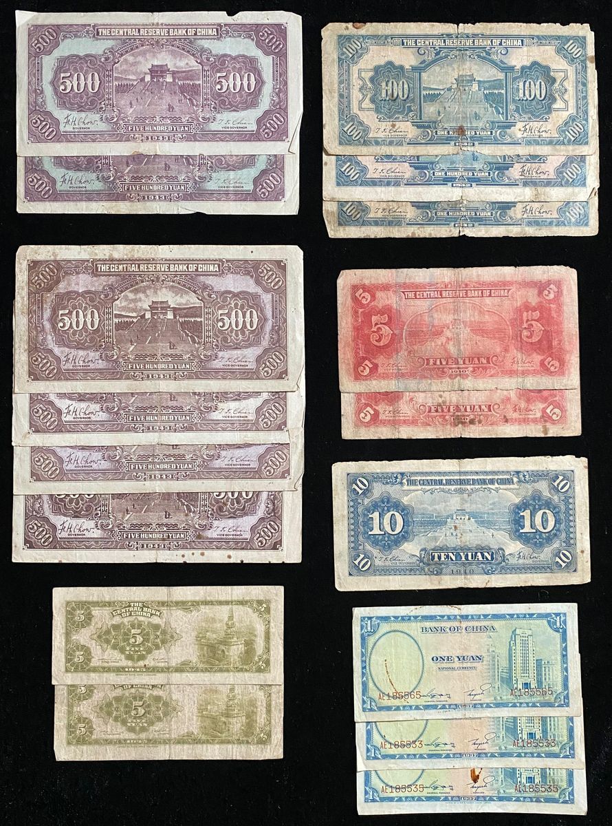 China, a group of 31 banknotes, consisting of 4x10 cents, 2x 20 cents, 3x 1 yuan, 4x 5 yuan, 100 yuan, 1000 and 2000 CGU, 2x 10000gold yuan, 100000 gold yuan from Central Bank of China, 2x 5 yuan, 10 yuan, 3x 100 yuan, 2x 500 yuan with serial number and 4x 500 yuan with block number from the Central Reserve Bank of China,