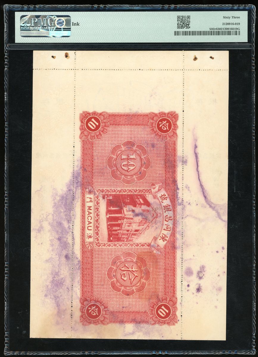 Chan Tung Cheng Bank, Macau, remainder 10 dollars, Year 23 (1934), no serial numbers, (Pick S92r), PMG 63, ink