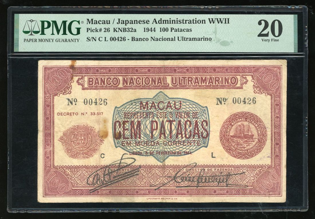 Bnco Nacional Ultramarino, Macau, WWII, 100 patacas, 5.2.1944, serial number 00426, (Pick 26), PMG 20, rust, minor restoration. A low mintage only 67,000 making it the second scarcest type after the 500 patacas. Quite rare