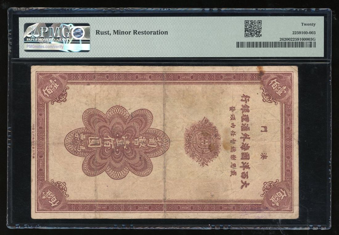 1944年日佔時期澳門大西洋海外匯理銀行壹佰圓,編號00426,PMG 20,有銹損及輕微修補。繼伍佰圓之後,屬於澳門日佔時期最罕見之紙鈔,僅發行67000枚,任何品相均少見