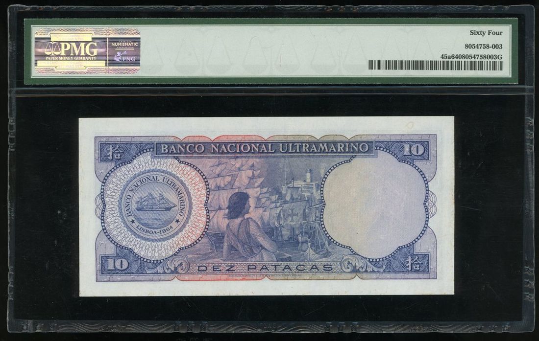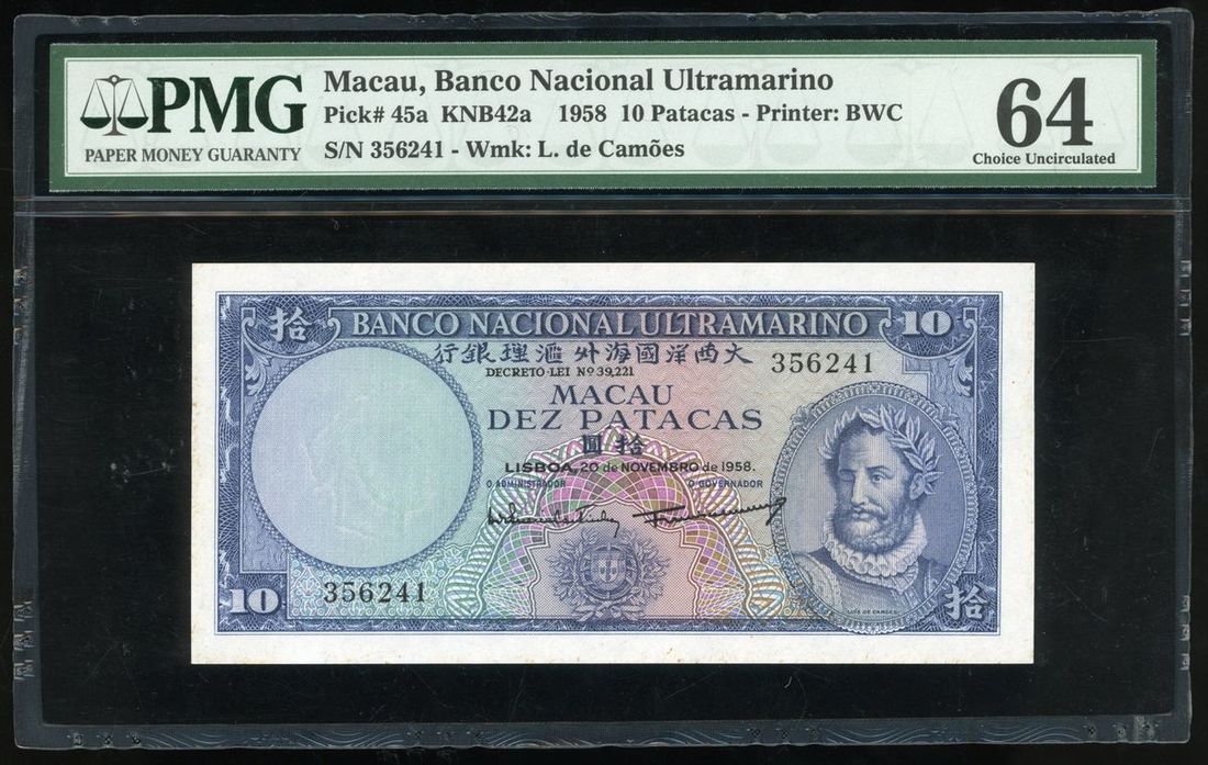 Banco Nacional Ultramarino, Macau, 10 patacas, 20.11.1958, snake serial number 356241, (Pick 45a), PMG 64 Choice Uncirculated