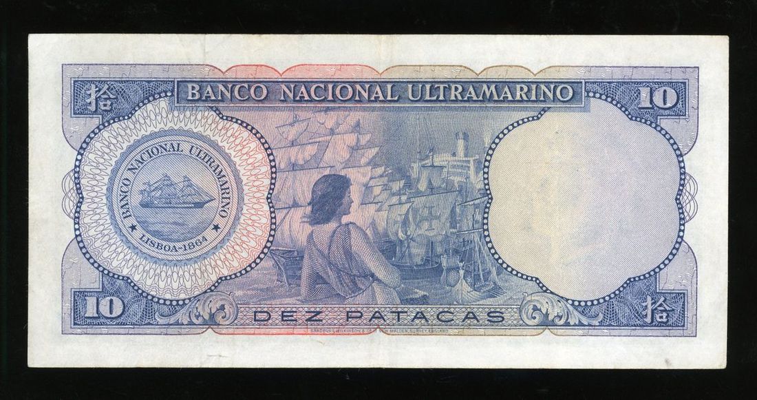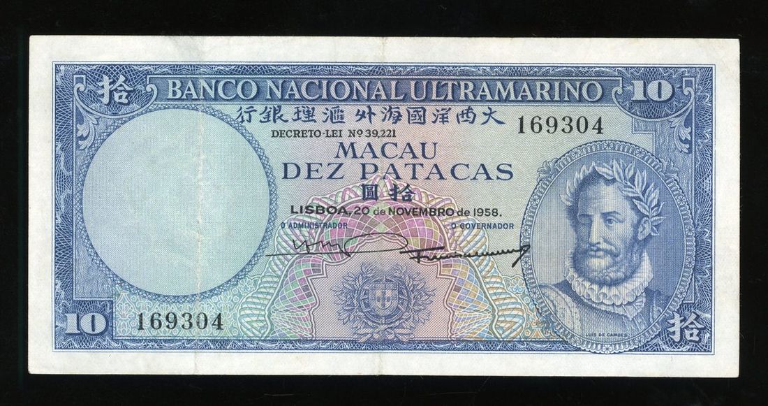 Banco Nacional Ultramarino, Macau, 10 patacas, 20.11.1958, serial number 169304, (Pick 45a), About Extremely Fine
