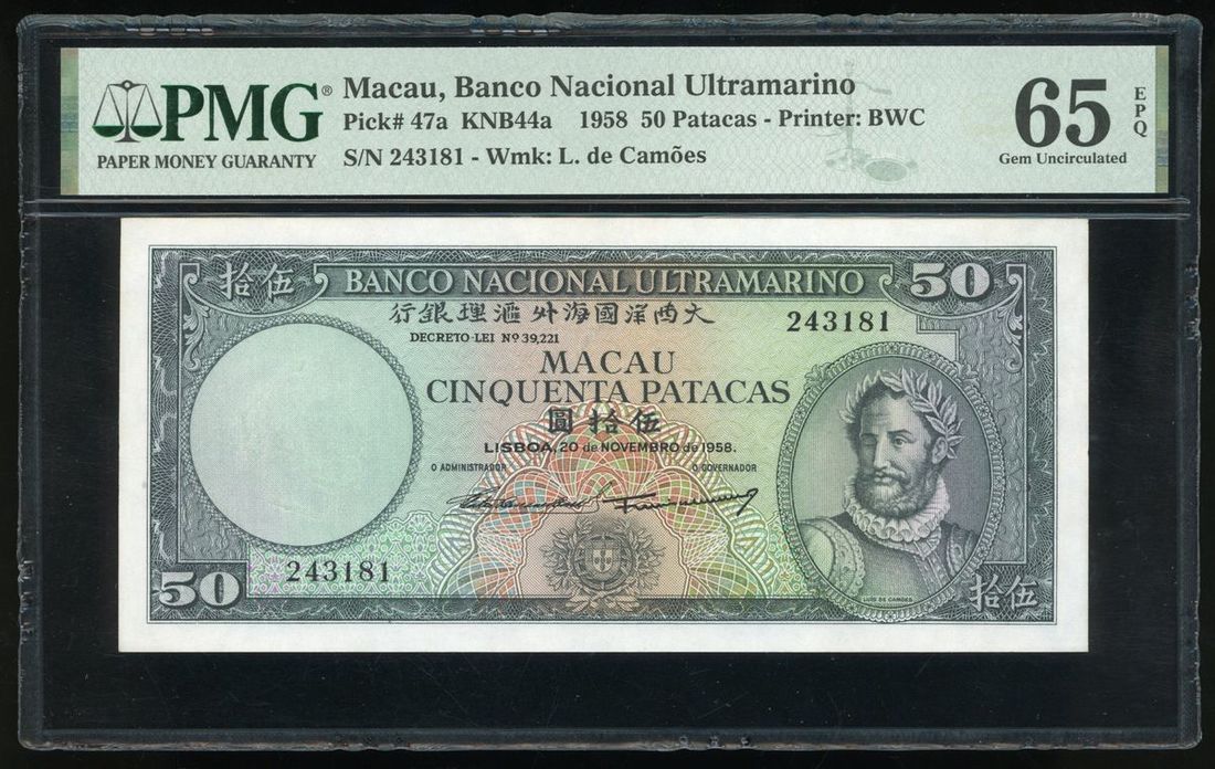1958年澳門大西洋海外匯理銀行伍拾圓,編號2434181,PMG 65EPQ,PMG評級紀錄中僅有8枚獲評更高分