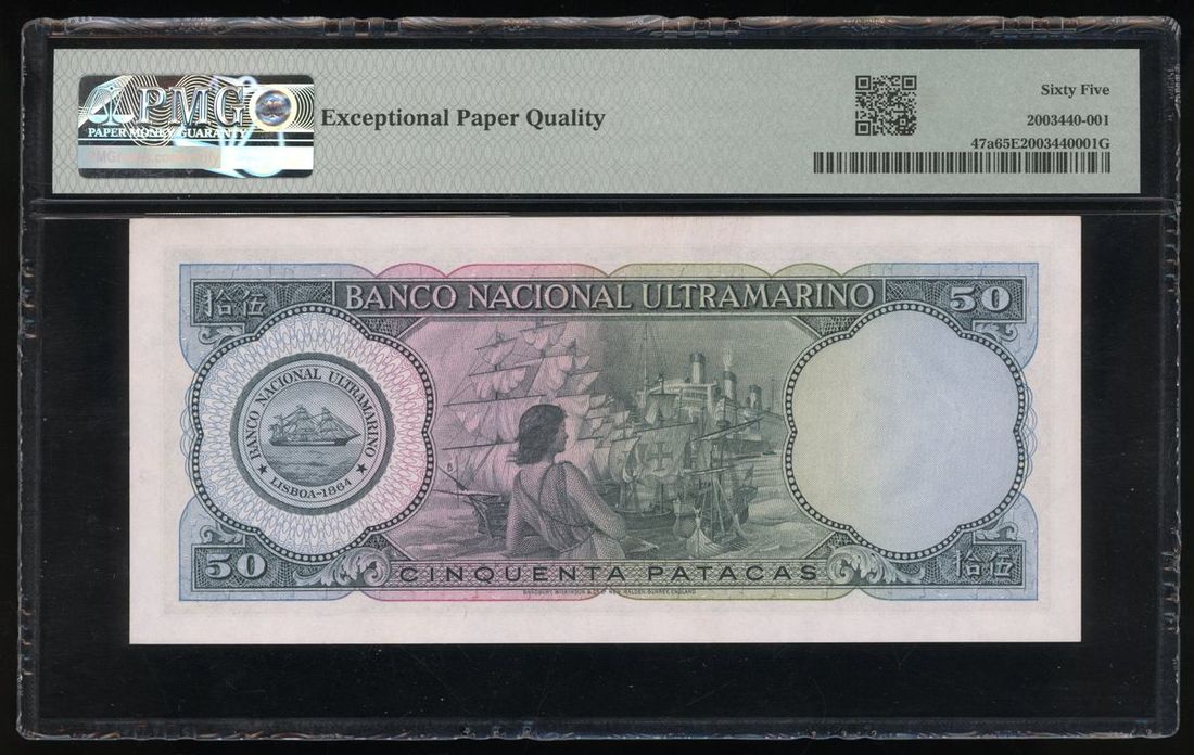 Banco Nacional Ultramarino, Macau, 50 patacas, 20.11.1958, serial number 2434181, (Pick 47a), PMG 65EPQ. Scarce high grade example with only less than 10 better.