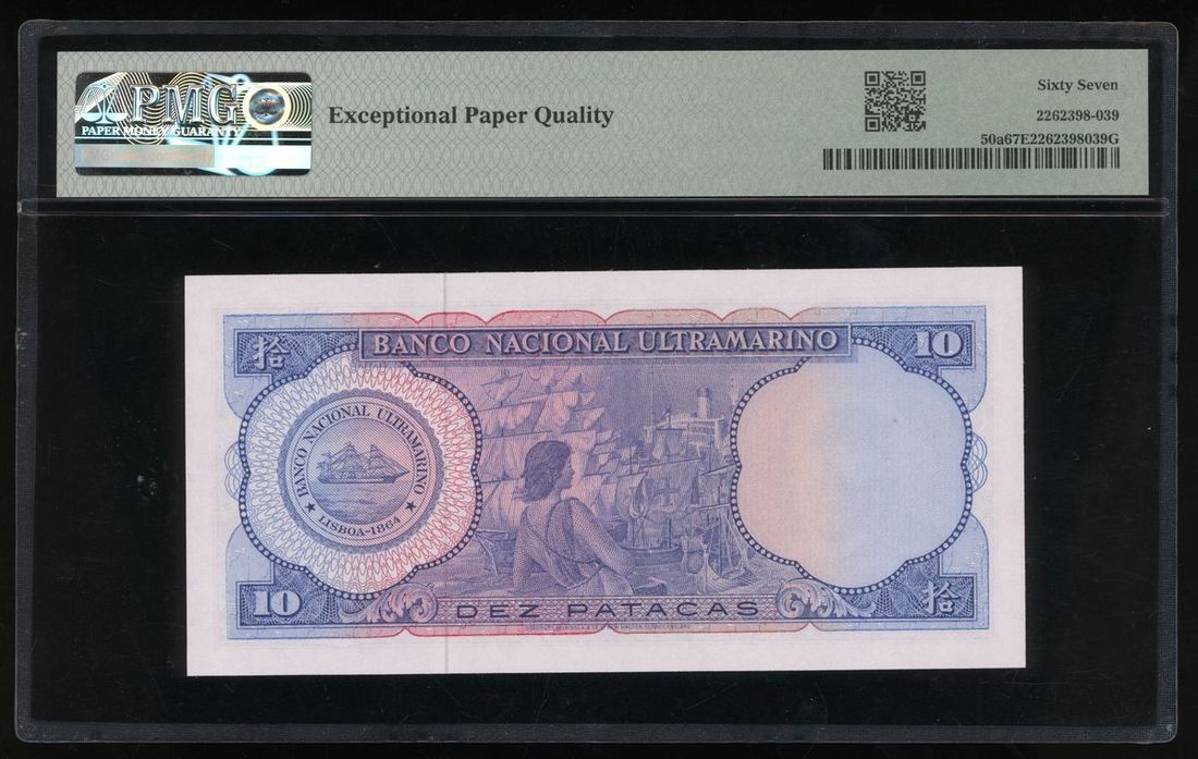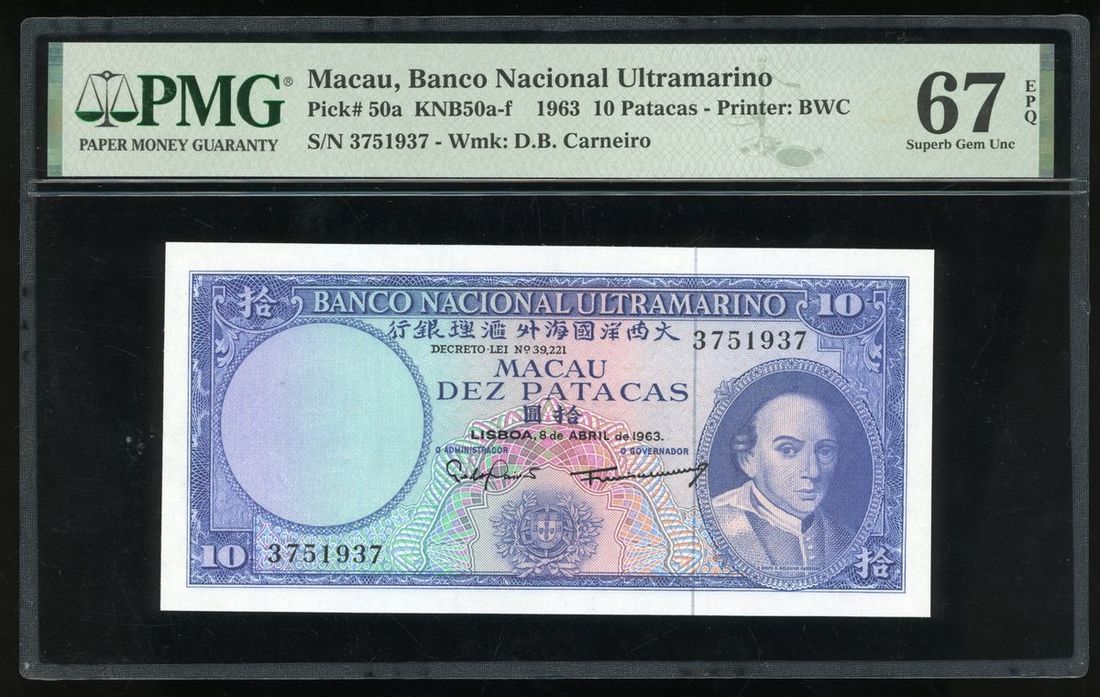 Banco Nacional Ultramarino, Macau, 10 patacas, 1963, serial number 3751937, (Pick 50a), PMG 67EPQ Superb Gem Uncirculated