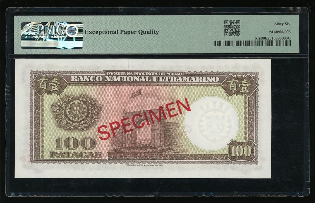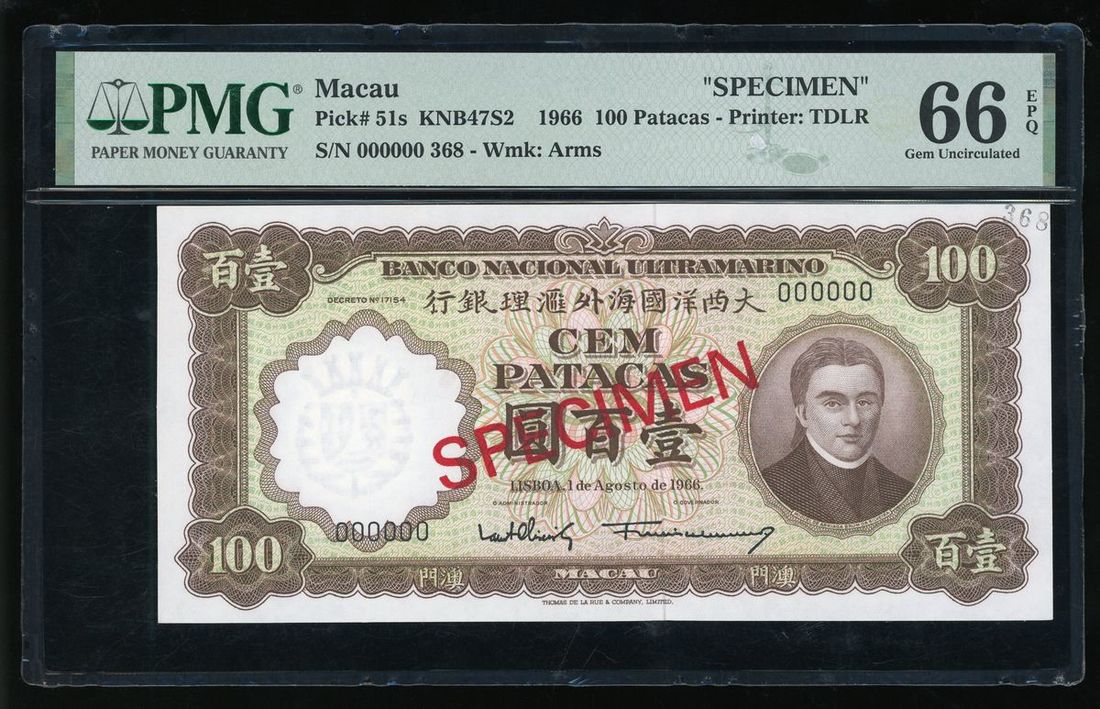 Banco Nacional Ultramarino, Macau, specimen 100 patacas, 1.8.1966, serial number 000000, (Pick 51s), PMG 66EPQ. Popular Macau specimen