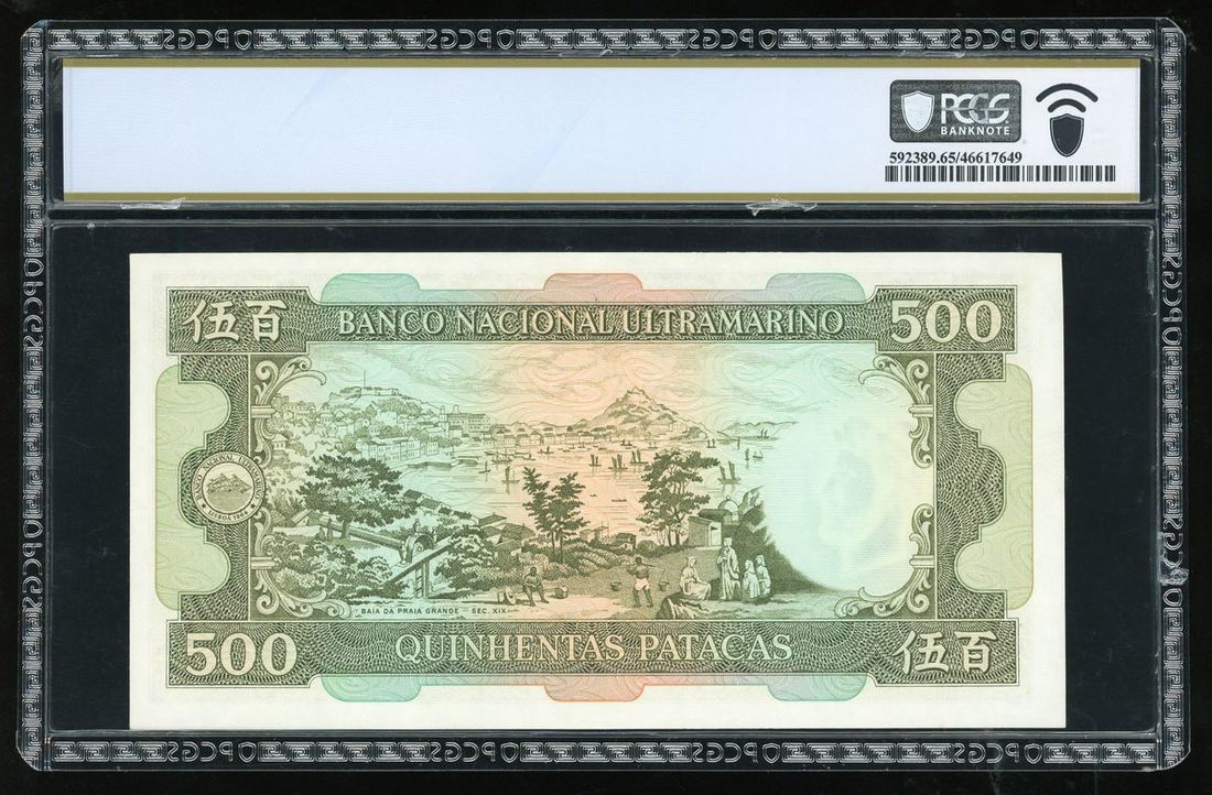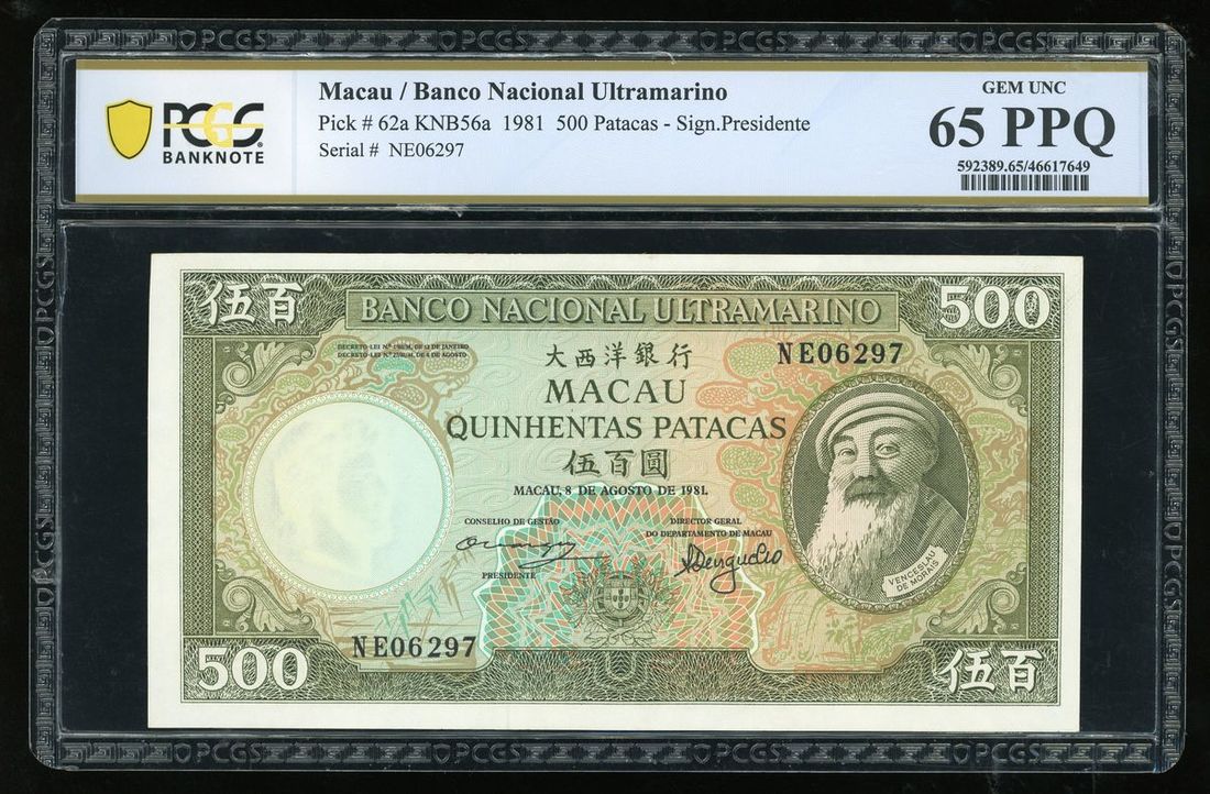 Banco Nacional Ultramarino, Macau, 500 patacas, 8.8.1981, serial number NE06297, (Pick 62a), PCGS 65OPQ gem UNC. High grade example of an always popular type