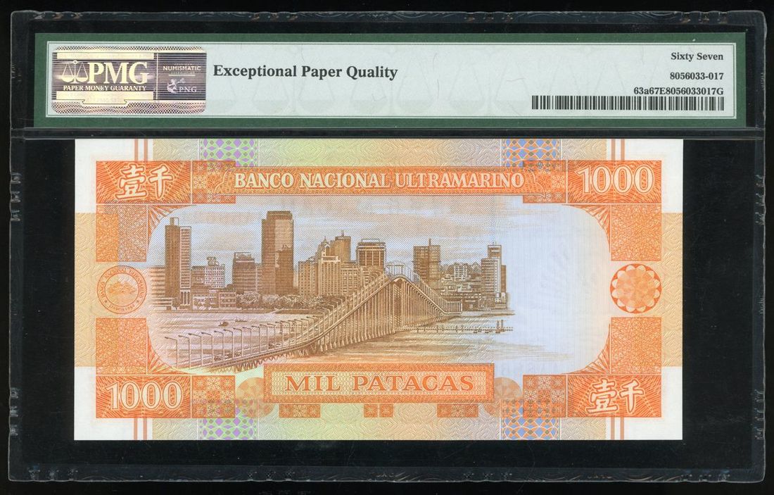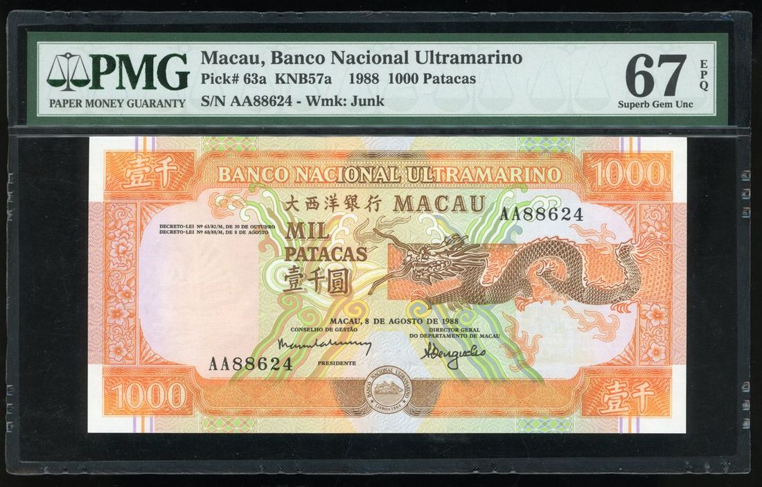 Banco Nacional Ultramarino, Macau, 1000 patacas, 8.8.1988, serial number AA88624, (Pick 63a), PMG 67EPQ Superb Gem Uncirculated