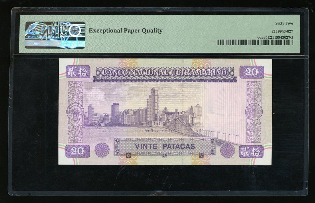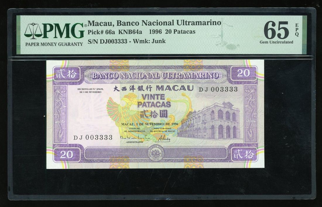 Banco Nacional Ultramarino, Macau, 20 patacas, 1996, fancy serial number DJ 003333, (Pick 66a), PMG 65EPQ Gem Uncirculated