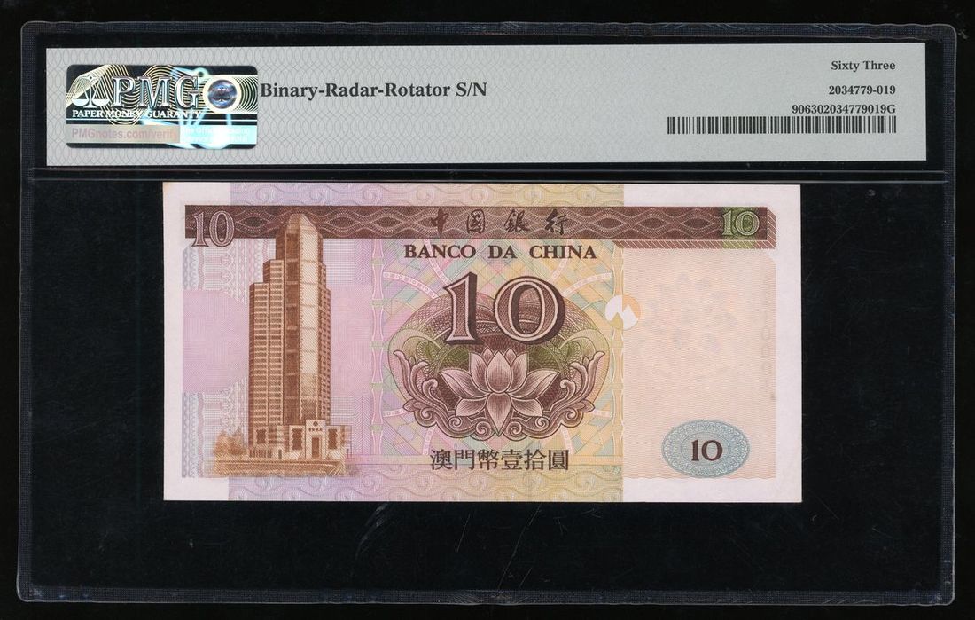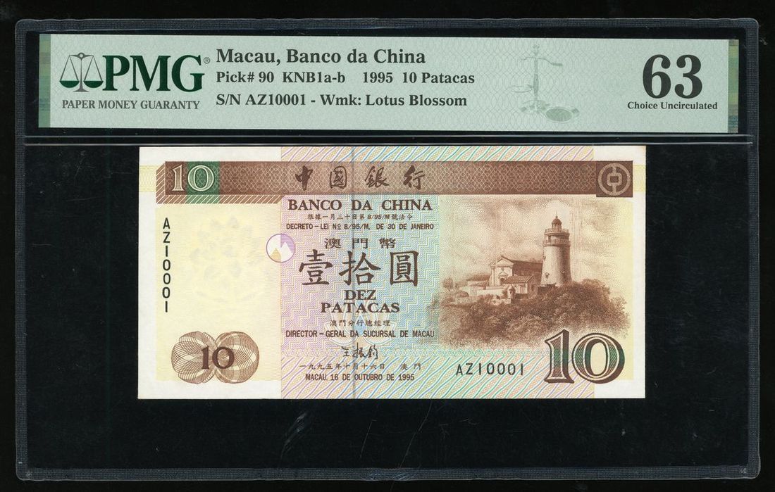 Banco da China, Macau, 10 patacas, 1995, binary radar rotator serial number AZ 10001, (Pick 90), PMG 63 Choice Uncirculated