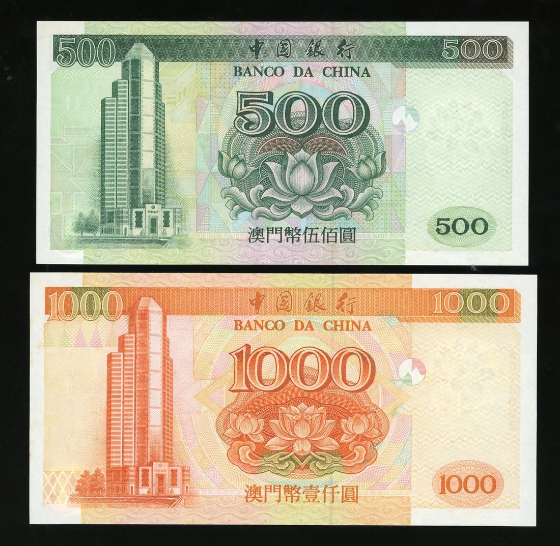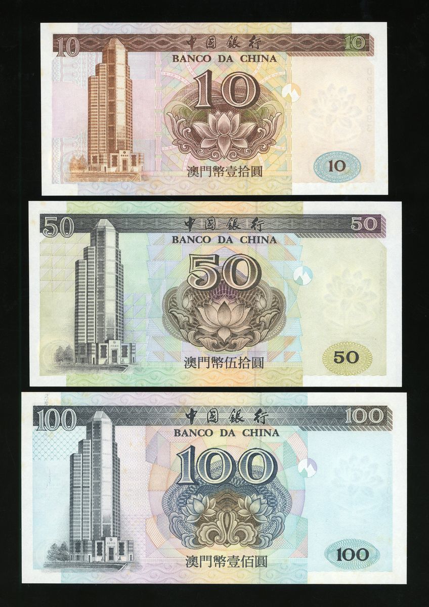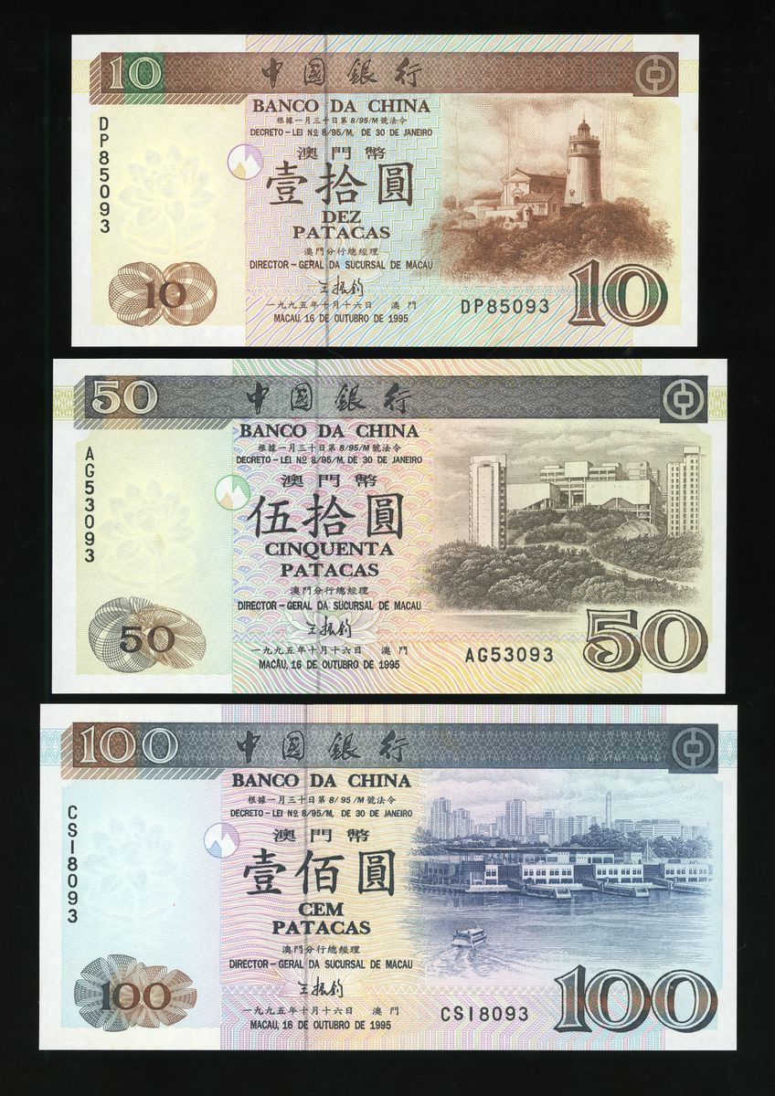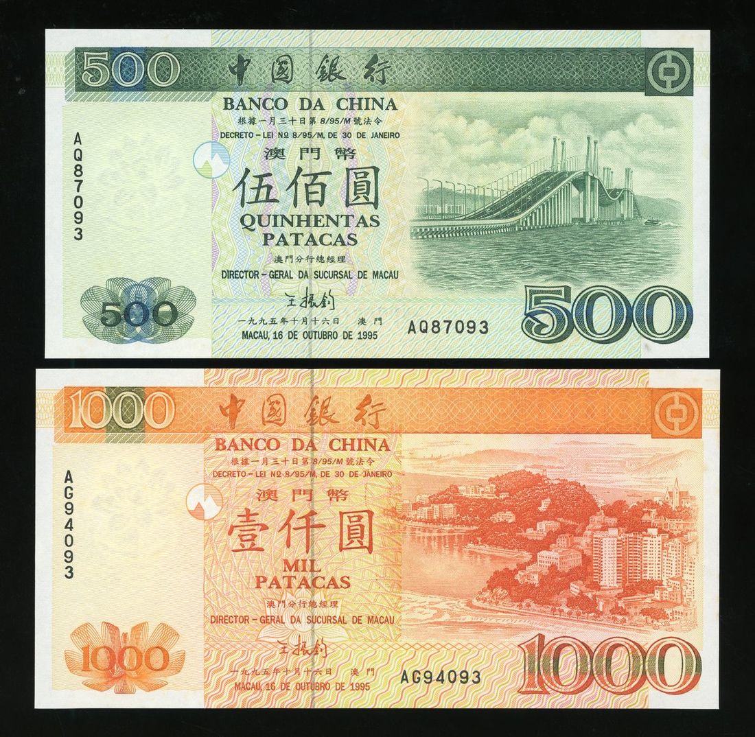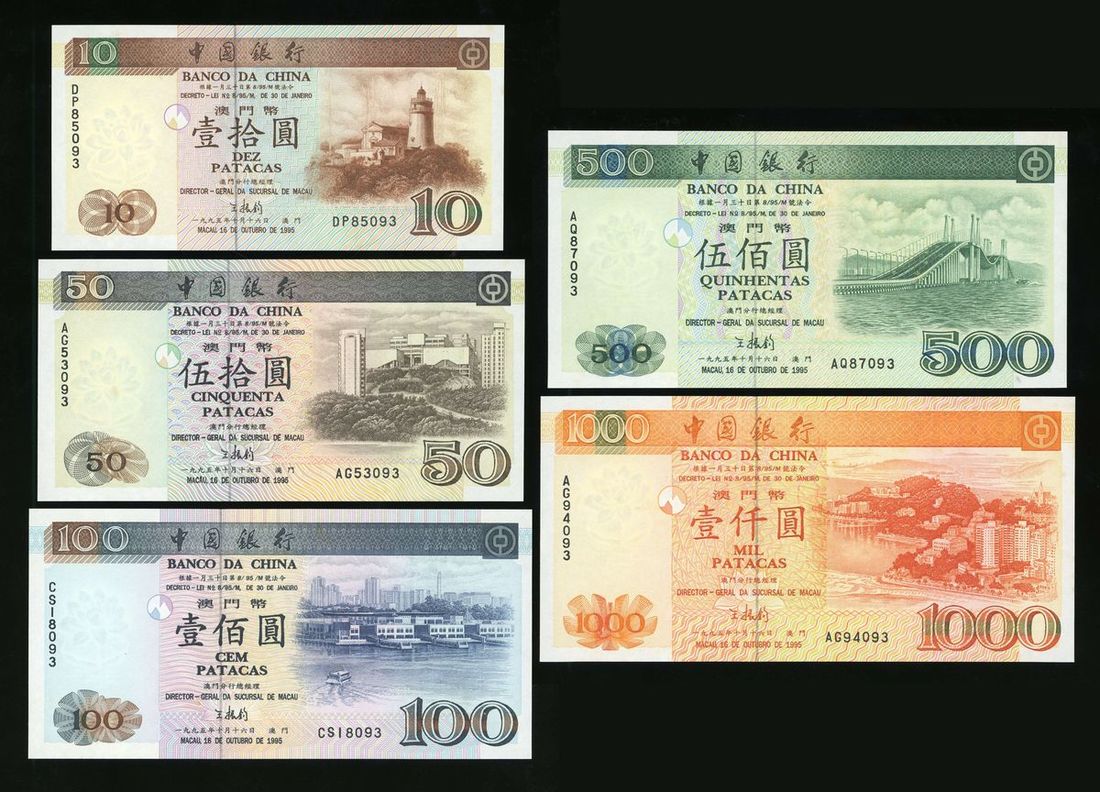 Banco da China, Macau, a set of the 1995 issue, including 5, 50, 100, 500 and 1000 patacas, serial numbers all ending '093',
