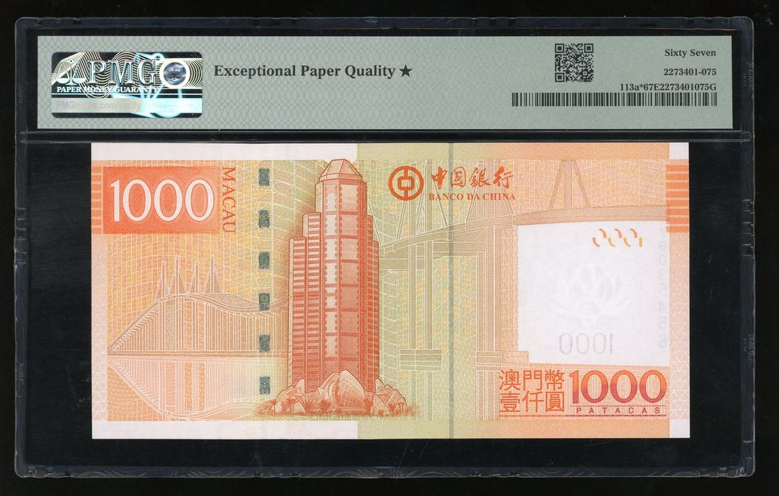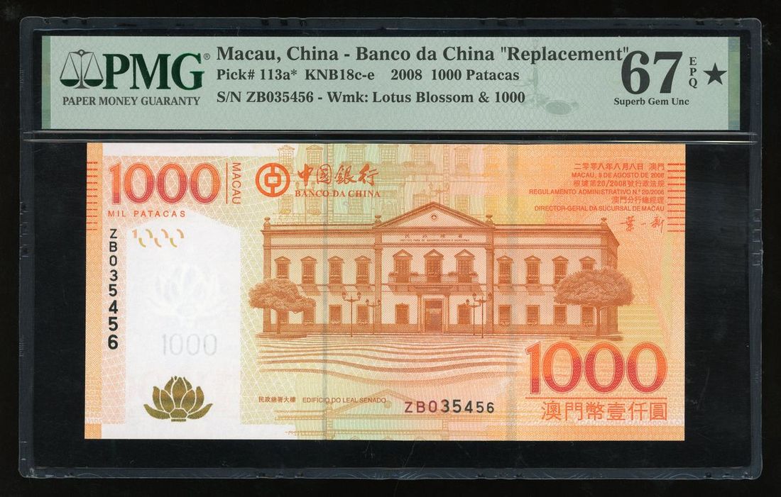 Banco Da China, Macau, REPLACEMENT 1000 patacas, 2008, serial number ZB 035456, (Pick 113a), PMG 67EPQ Superb Gem Uncirculated