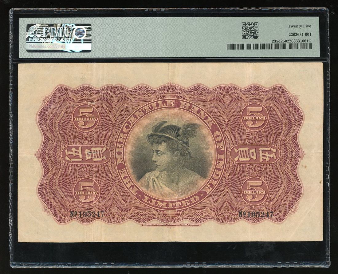 The Mercantile Bank of India Limited, Hong Kong, $5, 29.11.1941, serial number 195247, green, orange and multicoloured, coastal scene at centre, reverse maroon, Mercury at centre,