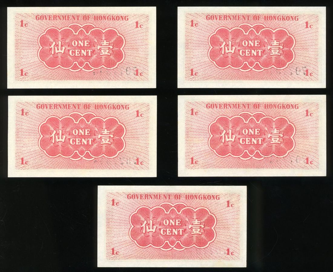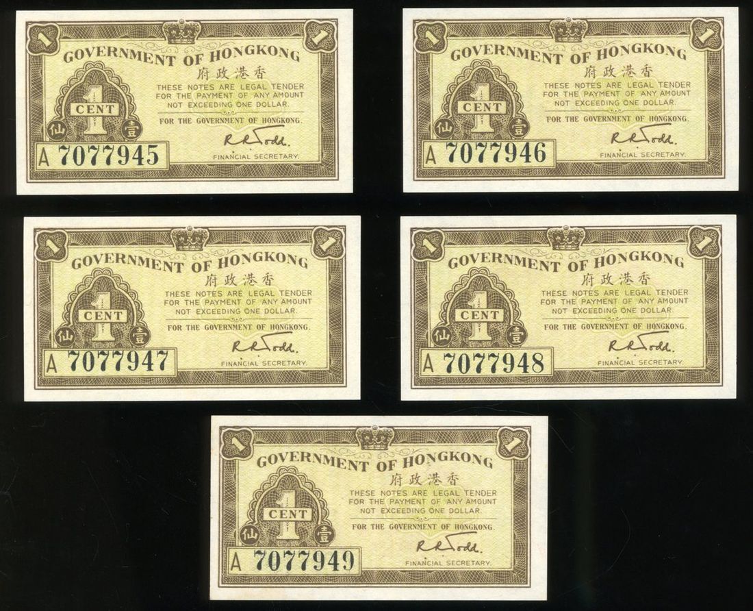 Government of HongKong, consecutive 1 cent (5), ND (1941), serial numbers A7077945/6/7/8/9, (Pick 313b) uncirculated (5)
