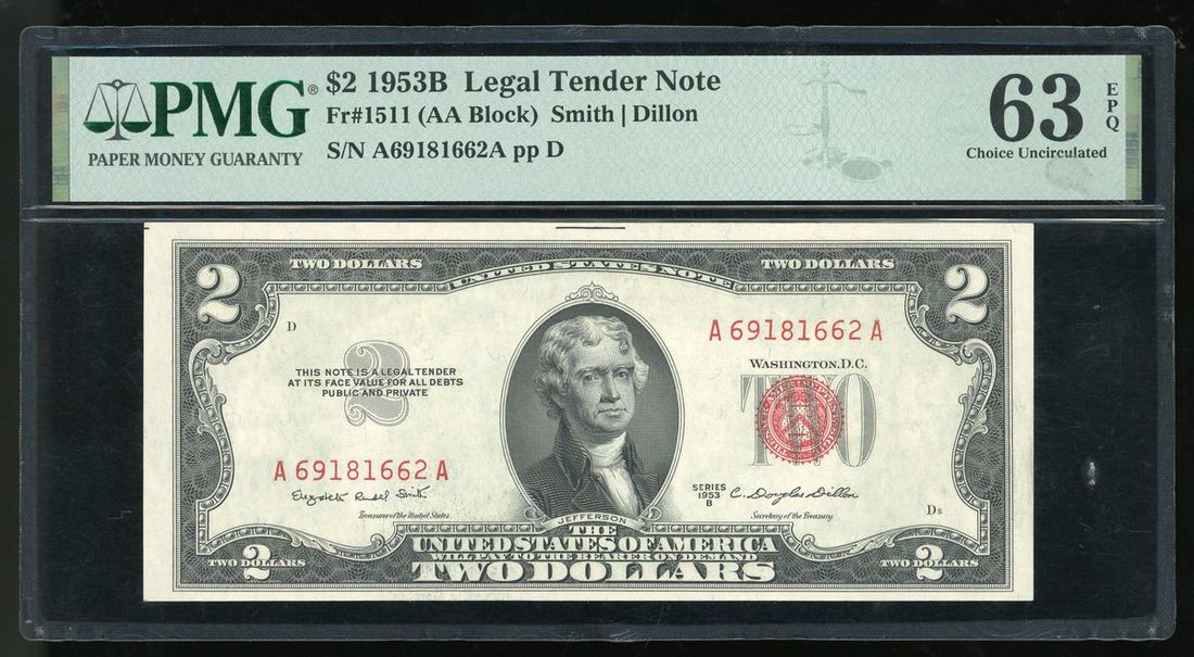 The United States, Legal Tender Note, $2, 1953B, serial number A 69181662 A ppD, (Fr#1511), PMG 63EPQ Choice Uncirculated