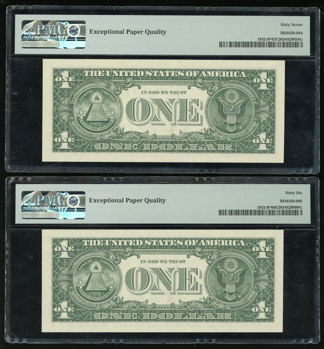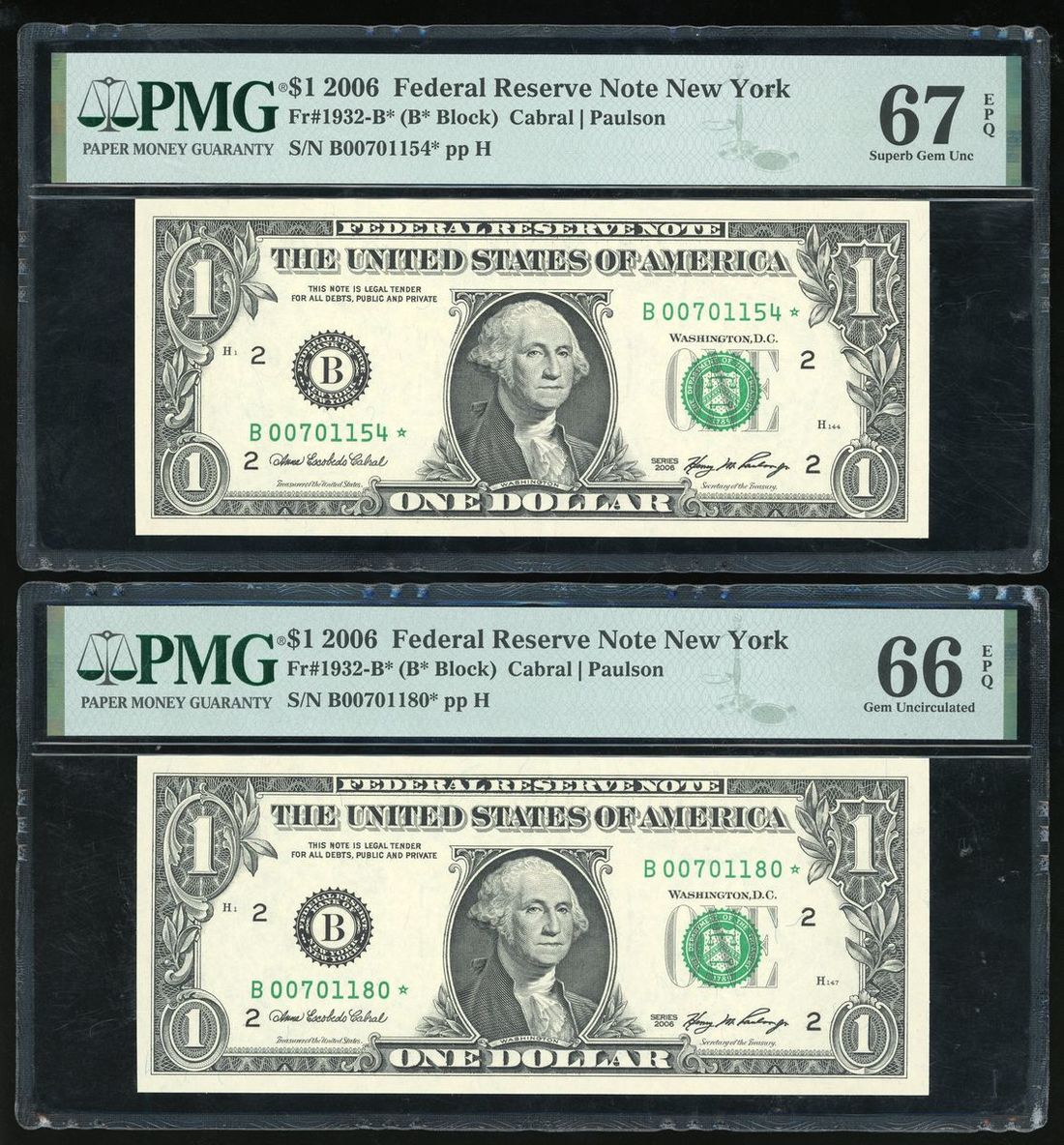 Federal Reserve Note New York, United States, a pair of $1, 2006, serial numbers B 00701180* pp H and B 00701154* pp H, (Fr#1932-B*) B* Block, PMG 66EPQ Gem Uncirculated and 67EPQ Superb Gem Uncirculated (2)