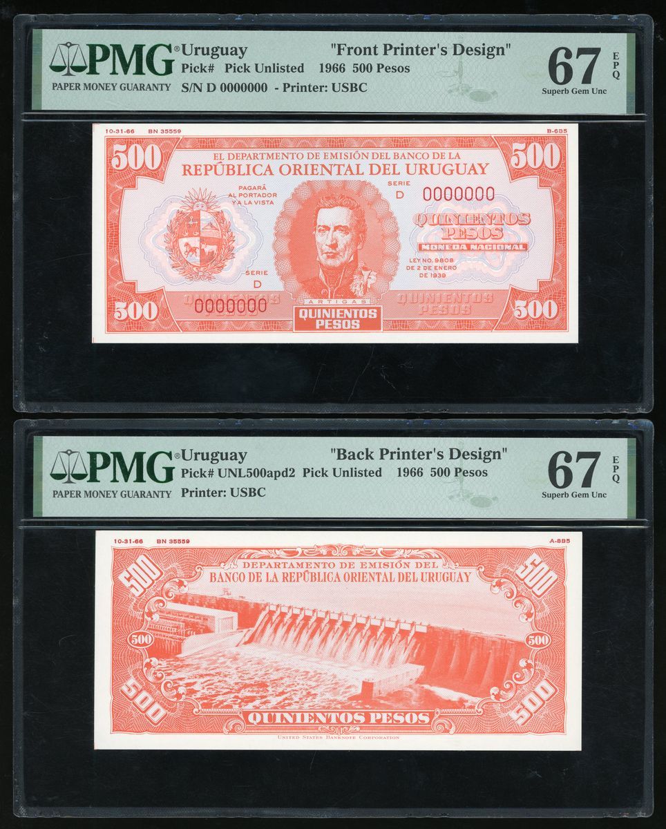 Banco de la República Oriental del Uruguay, 500 pesos, uniface obverse and reverse printer's design, 1966, serial number D 0000000,