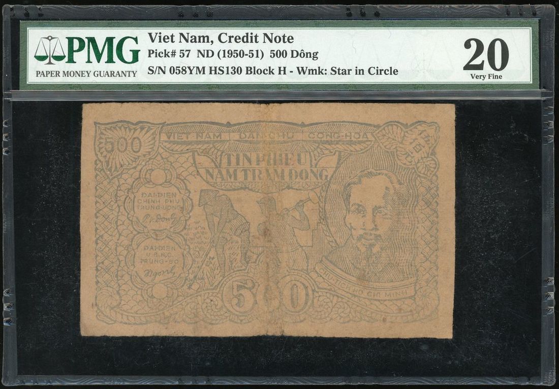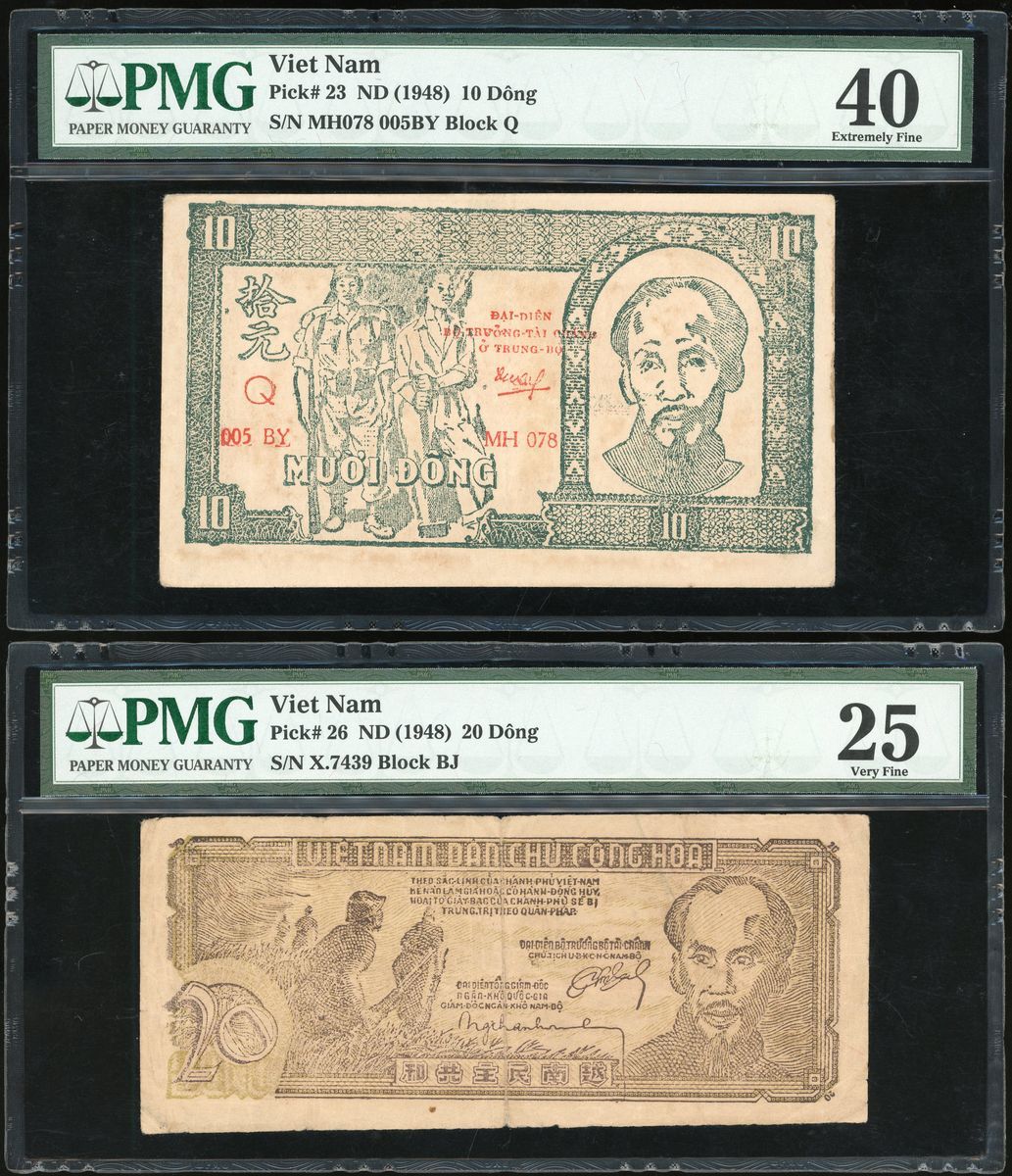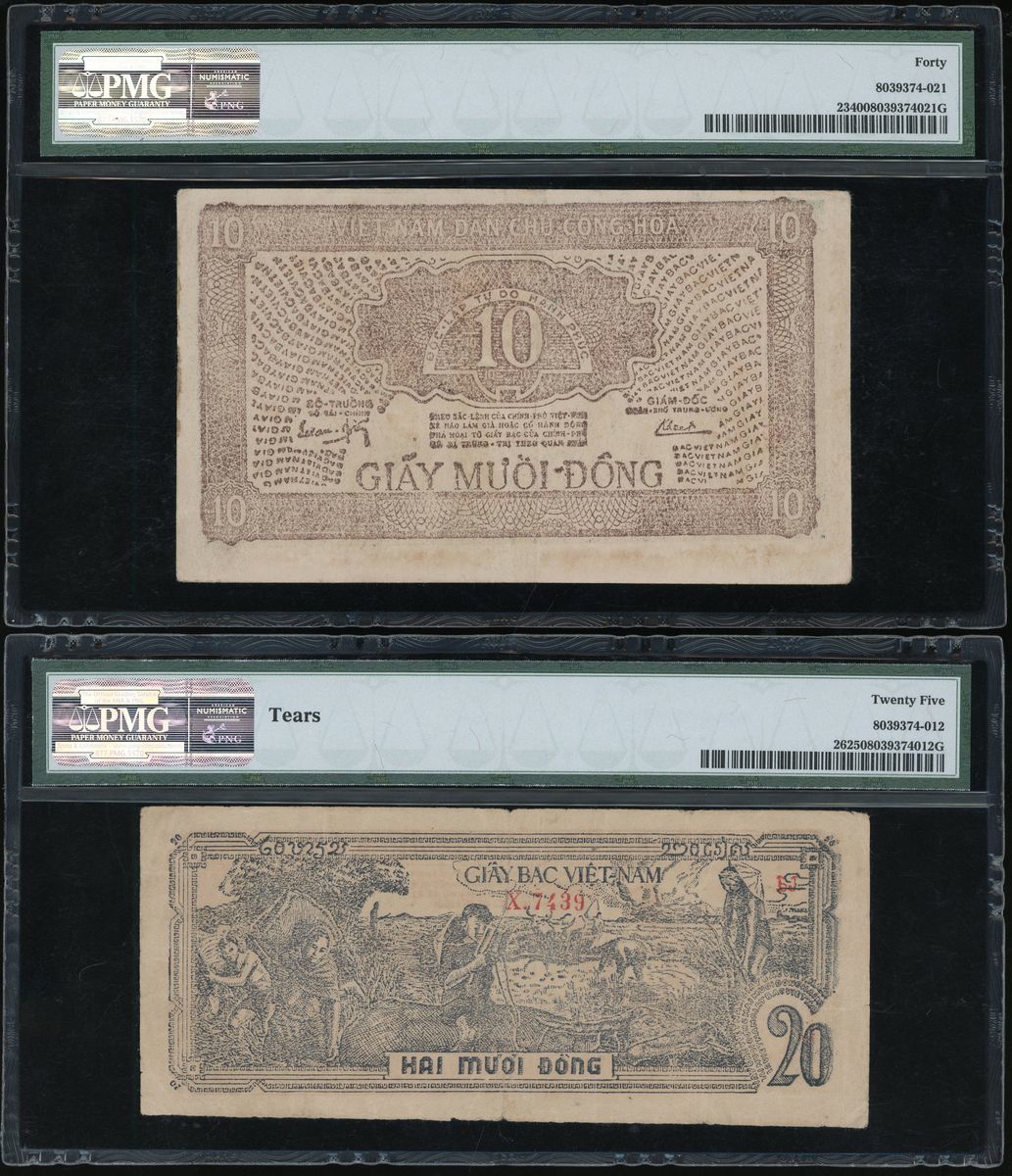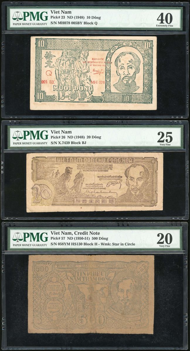 Vietnam, a group of 3x, including 10 and 20 dong ND (1948) and 500 dong (1950-51), (Pick 23, 26, 57), PMG 40, 25 (tears) and 20 respectively (3)