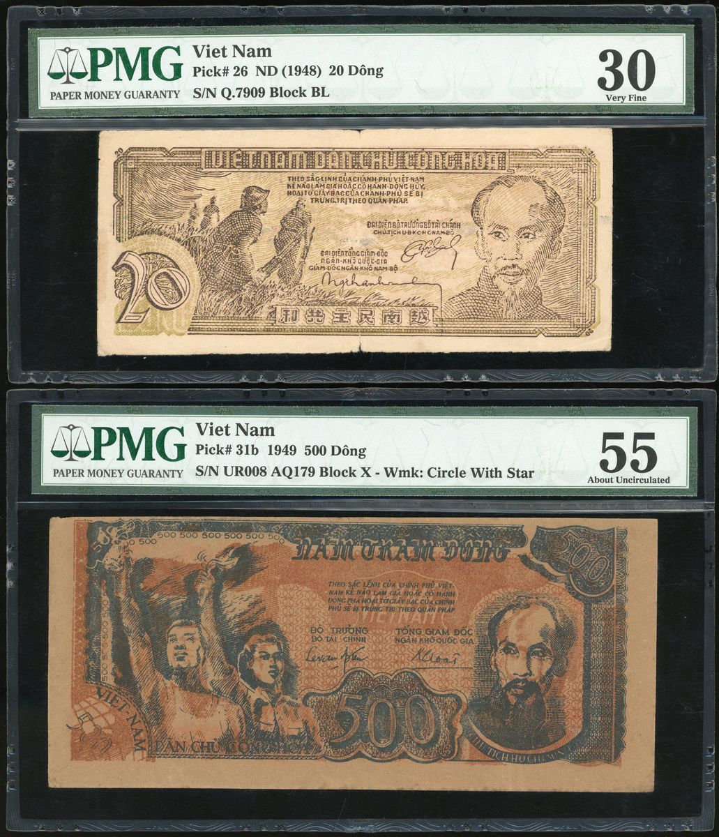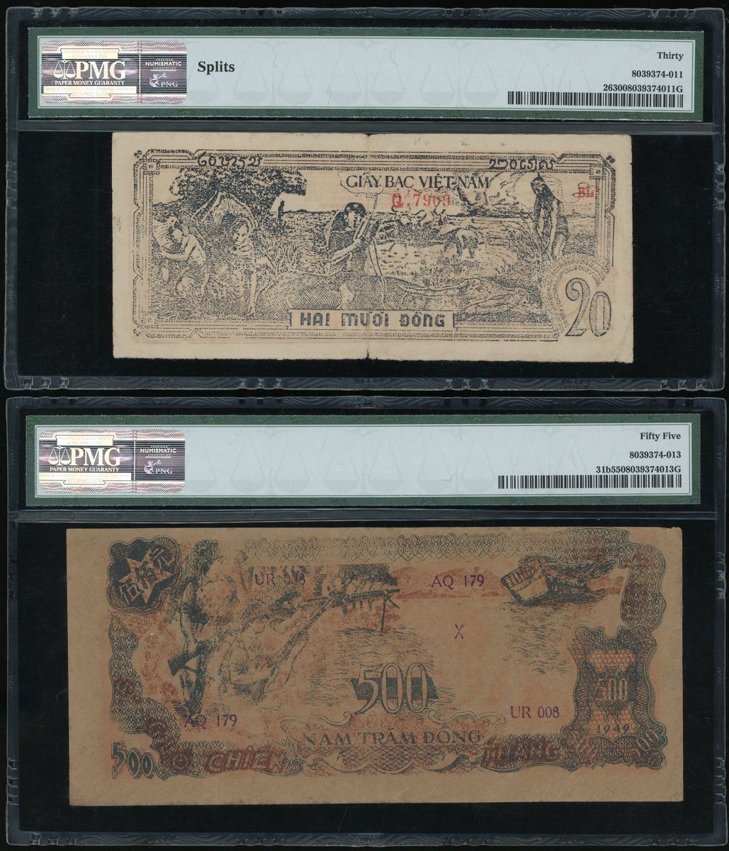 Vietnam, a pair, including 20 dong ND (1948), and 500 dong 1949, (Pick 26, 31b), PMG 30 (splits) and 55 respectively (2)