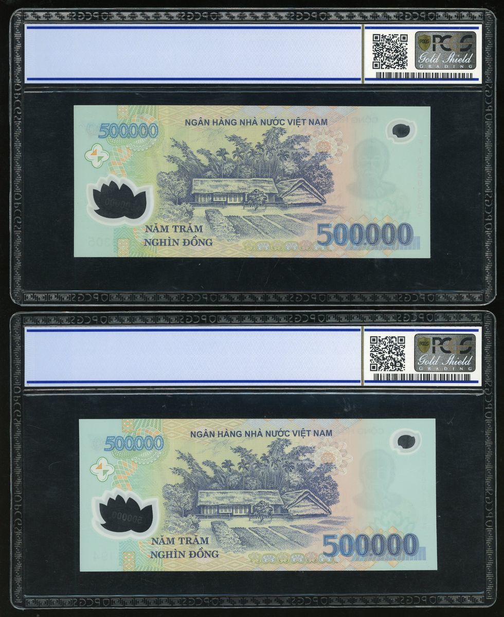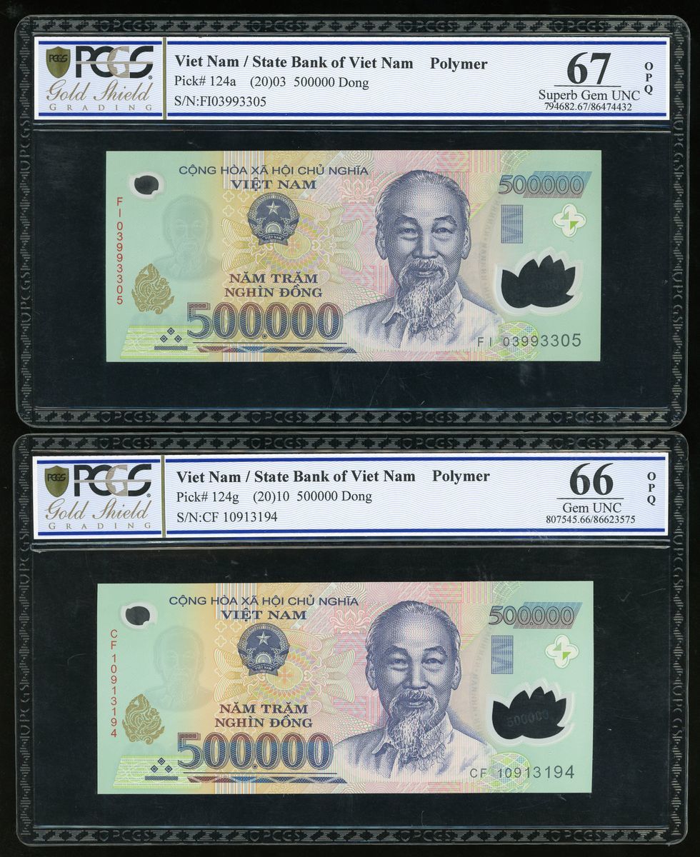 Vietnam, 500,000 dong (2), 2003/2010, serial number FI 03993305, CF 10913194, (Pick 124a, g), PCGS 67OPQ, 66OPQ respectively (2)